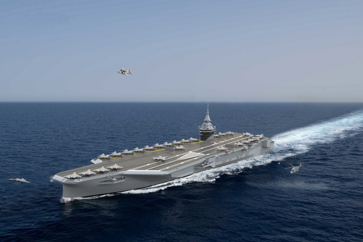 epa08870771 A handout photo made available by Naval Group on 08 December 2020 shows a digital reproduction of the future nuclear-powered aircraft carrier of the French Navy named PANG (Porte-Avions de Nouvelle Generation). The PANG is planned to replace the Charles de Gaulle aircraft carrier in 2038. EPA/NAVAL GROUP / HANDOUT HANDOUT HANDOUT EDITORIAL USE ONLY/NO SALES