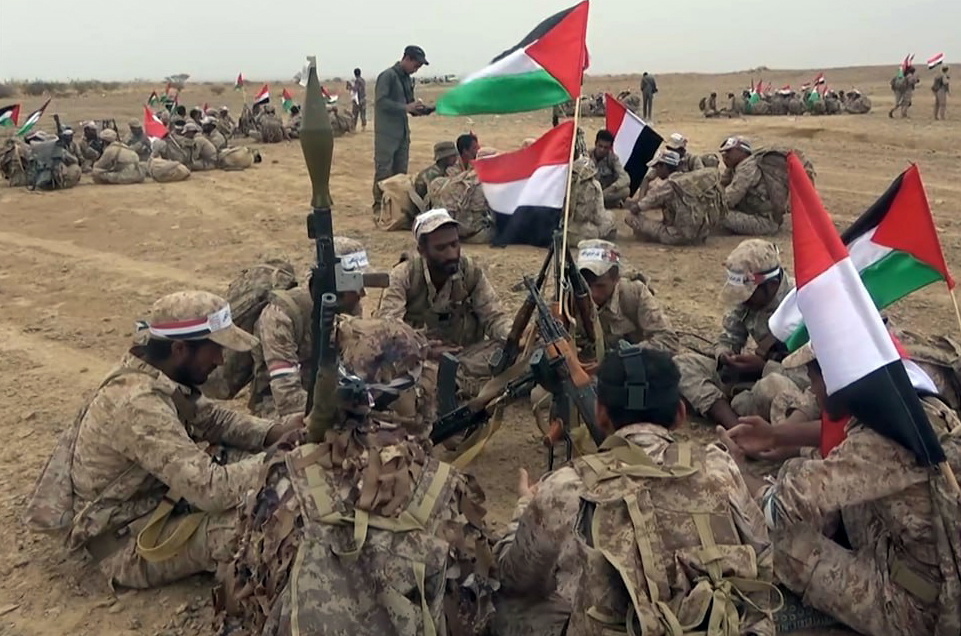 epa10951170 A handout photo made available by the Houthis media center shows Houthi fighters holding Palestinian and Yemenis flags during a military maneuver to express solidarity with the Palestinian people on the outskirts of Sana'a, Yemen, 29 October 2023 (Issued 31 October 2023). The Houthis announced on 31 October 2023 that they had launched ballistic missiles and drones towards Israel in support of the Palestinian people amid the ongoing conflict between Israel and Hamas. Thousands of Israelis and Palestinians have died since the militant group Hamas launched an unprecedented attack on Israel from the Gaza Strip on 07 October, and the Israeli strikes on the Palestinian enclave which followed it. EPA/HOUTHIS MEDIA CENTER / HANDOUT EDITORIAL USE ONLY/NO SALES HANDOUT EDITORIAL USE ONLY/NO SALES HANDOUT EDITORIAL USE ONLY/NO SALES