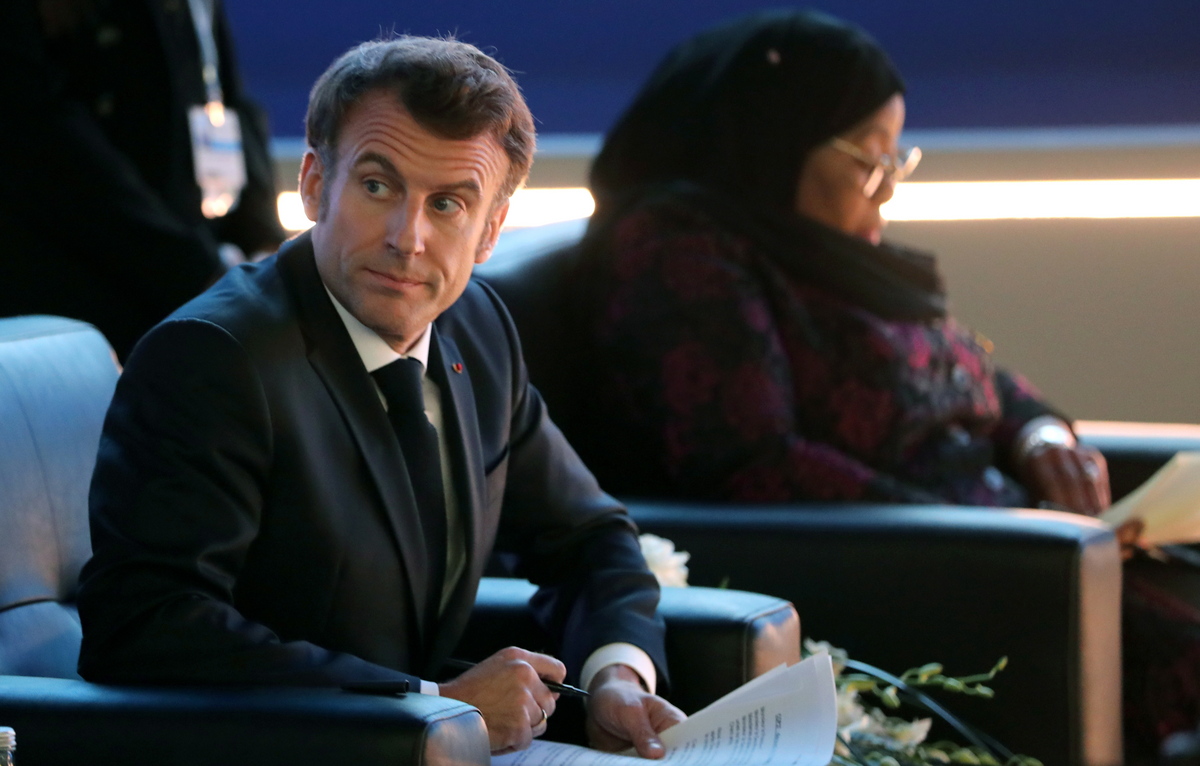 epa10292370 French President Emmanuel Macron attends the 2022 United Nations Climate Change Conference (COP27), in Sharm El-Sheikh, Egypt, 07 November 2022. The 2022 United Nations Climate Change Conference (COP27), running from 06 to 18 November in Sharm El-Sheikh, is expected to host one of the largest number of participants in the annual global climate conference of over 40,000 estimated attendees, including heads of states and governments, civil society, media and other relevant stakeholders. The events will include Climate Implementation Summit, thematic days, flagship initiatives, and Green Zone activities engaging with climate and other global challenges. EPA/KHALED ELFIQI