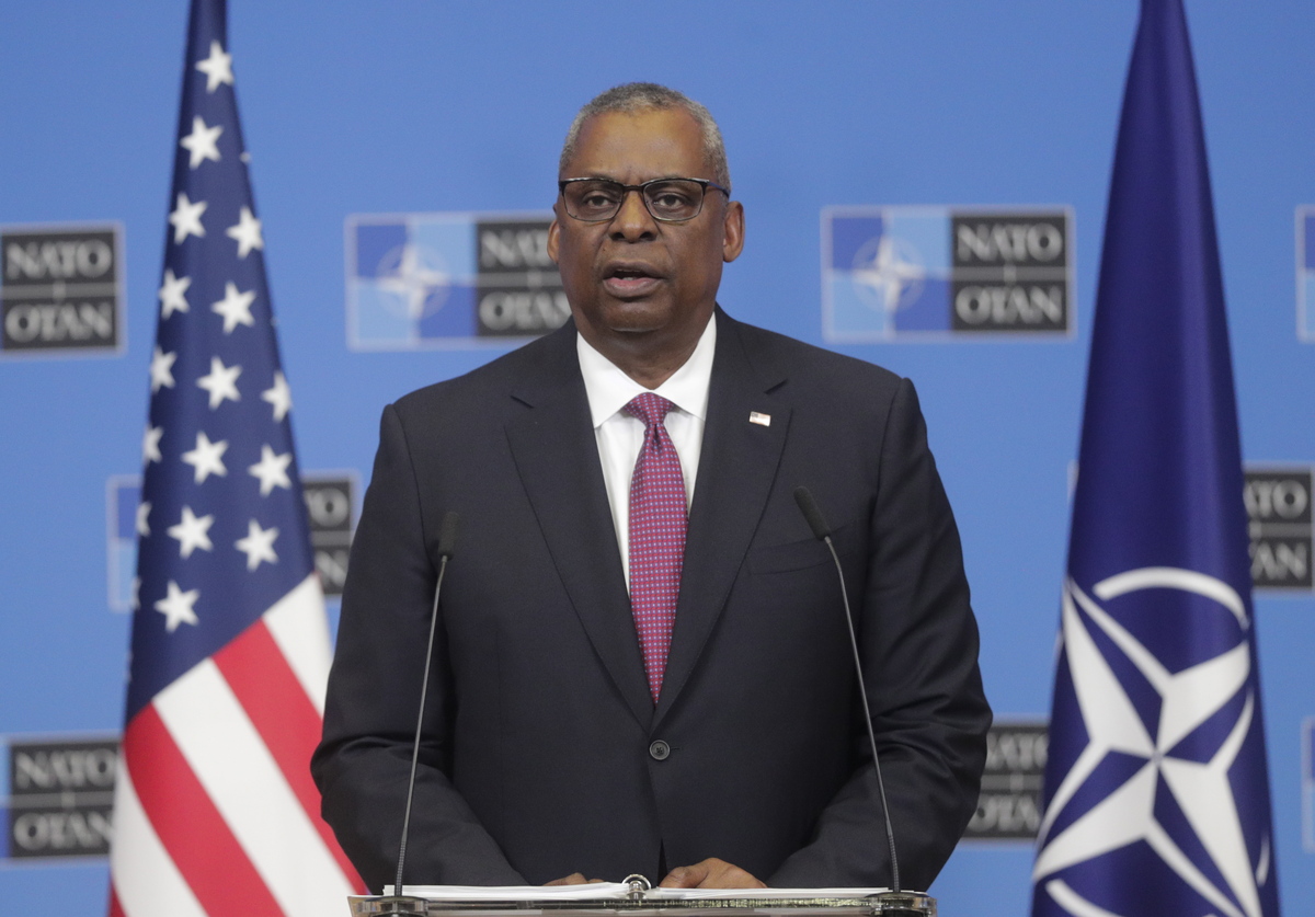 epa10468294 United States Secretary of Defense Lloyd Austin gives a press briefing during a NATO defense ministers meeting at the alliance's headquarters in Brussels, Belgium, 15 February 2023. Defense Ministers of the North Atlantic Treaty Organization (NATO) countries gather in Brussels from 14 to 15 February. EPA/OLIVIER HOSLET