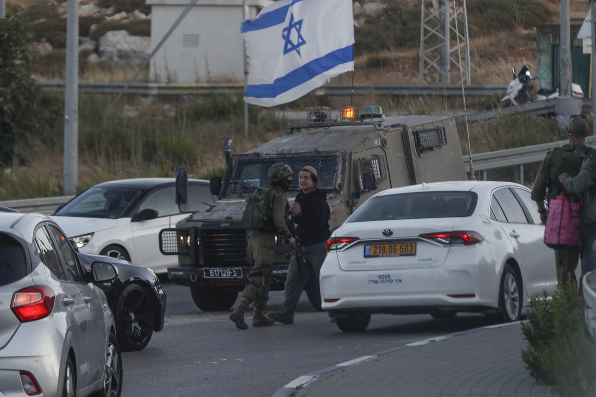 epa10702243 Israeli soldiers prevent Israeli settlers from attacking a Palestinian car on a road leading to the West Bank city of Ramallah, following the shooting in the settlement of Eli, between Nablus and Ramallah, in the West Bank, 20 June 2023. Four people were killed and one was injured in a shooting at a gas station at the entrance of the Eli settlement, Israeli Defense Forces (IDF) reported. Israeli Army is searching the perpatrators of the shooting and has set up road blockades. EPA/ATEF SAFADI
