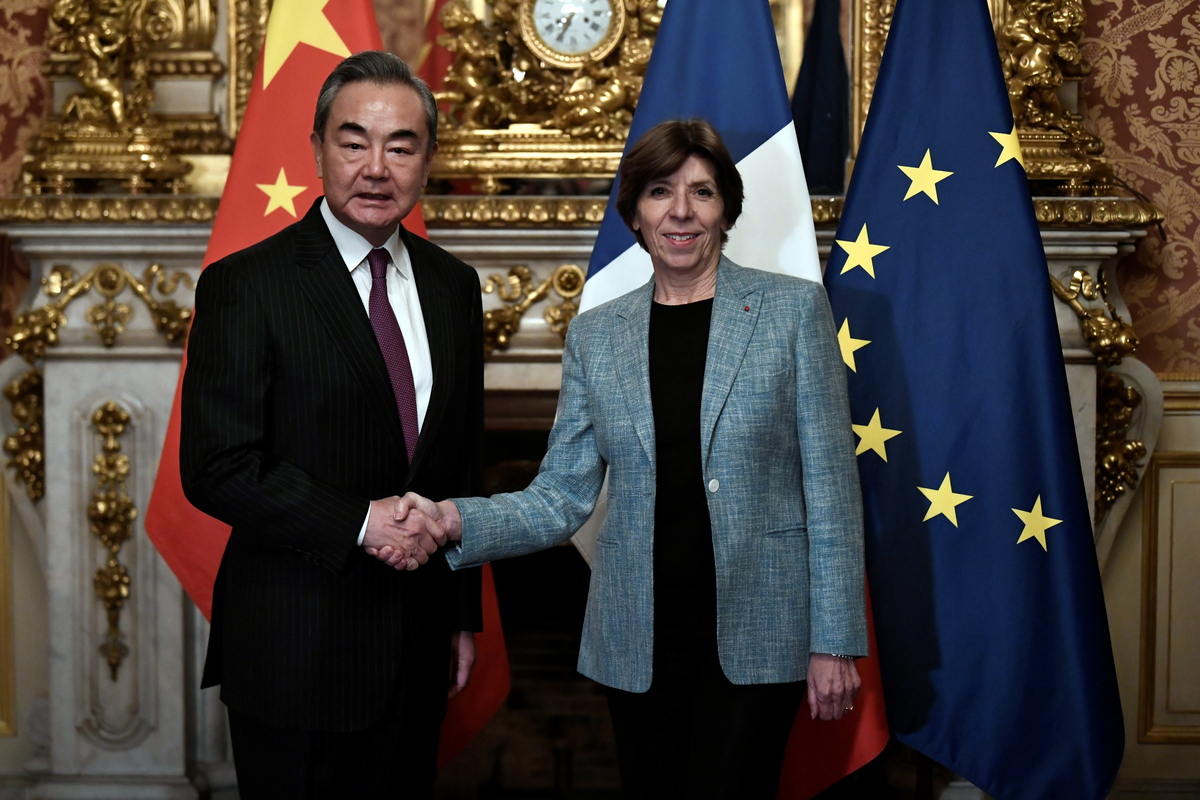 epa10469013 China's Foreign minister Wang Yi (L) shakes hands with French Foreign and European Affairs Minister Catherine Colonna (R), ahead of their meeting in Paris, France, 15 February 2023. EPA/STEPHANE DE SAKUTIN / POOL MAXPPP OUT