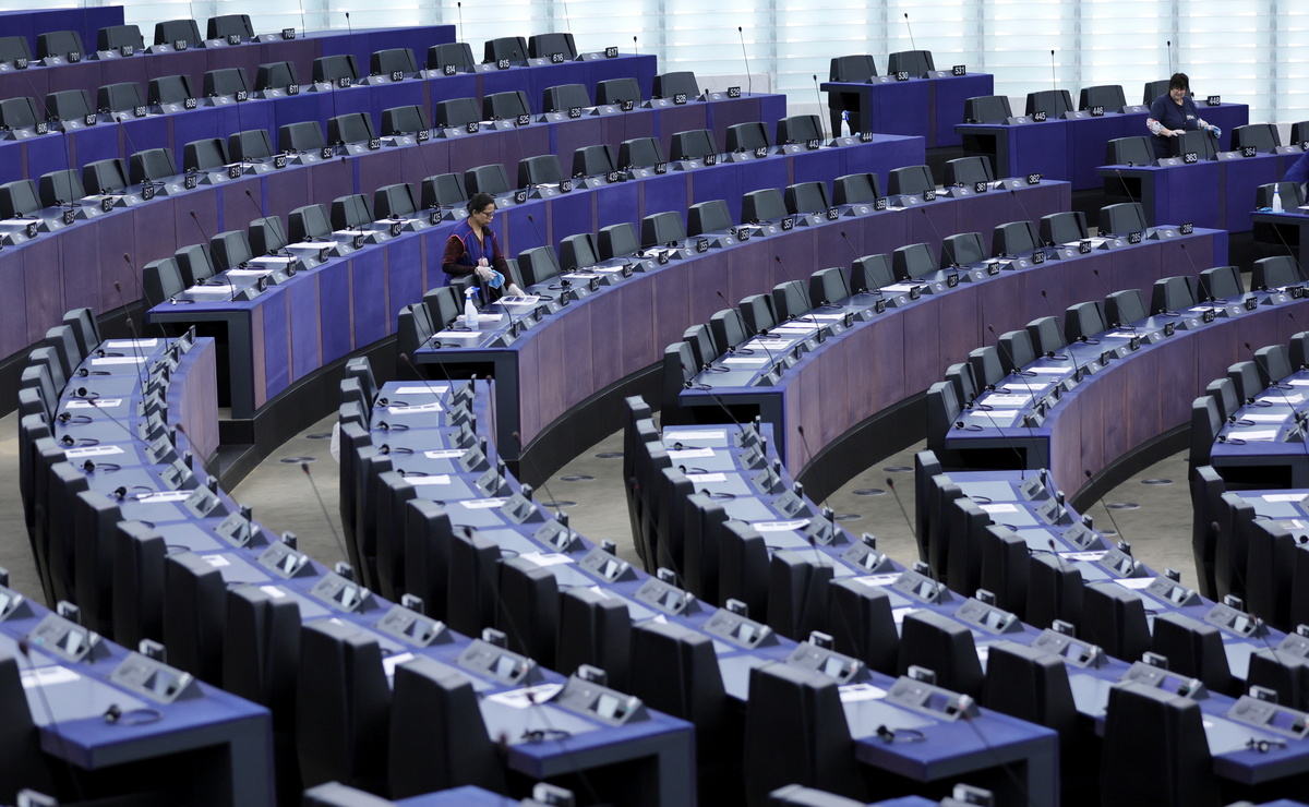 epa11217774 An employee cleans the benches in the plenary chamber before a debate on the 'Need to address the urgent concerns surrounding Ukrainian children forcibly deported to Russia' at the European Parliament in Strasbourg, France, 13 March 2024. The EU Parliament's session runs from 11 till 14 March 2024. EPA/RONALD WITTEK