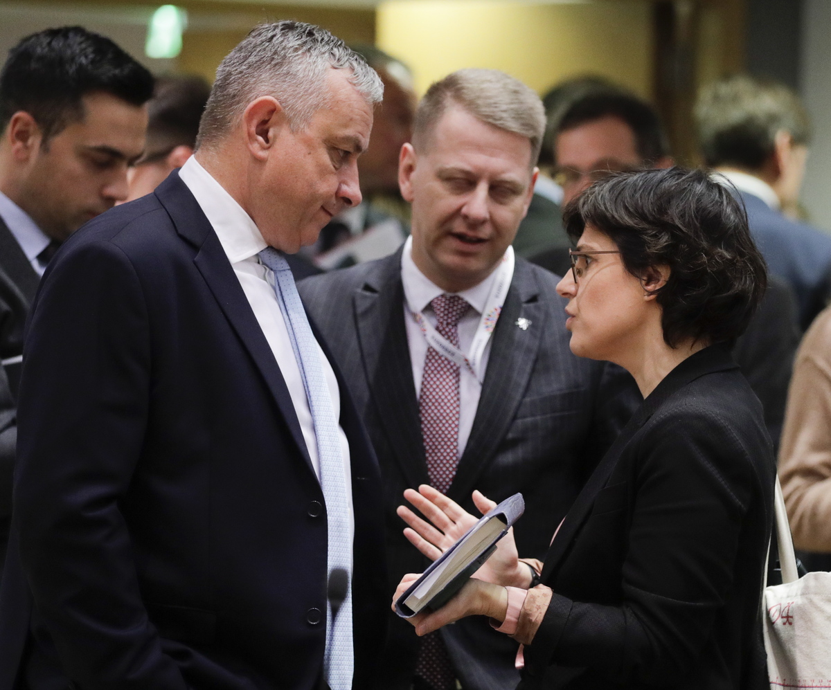 epa10324173 Czech Minister for Industry and Trade Jozef Sikela (L) and Belgian energy minister Tinne Van der Straeten (R) converse during a Special EU energy council on energy crisis in Brussels, Belgium, 24 November 2022. Ealier this week, the EU commission proposed an EU gas price cap, only to activate if the price per MWh on the TTF index (the benchmark for 80 percent of the EU market) exceeds 275 euro for a fortnight in a row, and the difference with the world price of liquified natural gas (LNG) is equal to or greater than 58 euro. This plan was highly criticized by members states. EPA/OLIVIER HOSLET