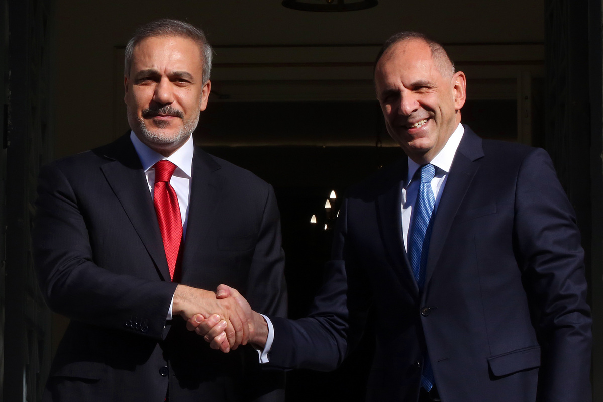 Ο υπουργός Εξωτερικών Γιώργος Γεραπετρίτης(Δ) υποδέχεται τον υπουργό Εξωτερικών της Τουρκίας Hakan Fidan, (Χακάν Φιντάν) (Α) στη συνάντησή τους στο υπουργείο Εξωτερικών, Αθήνα, Παρασκευή 8 Νοεμβρίου 2024. ΑΠΕ-ΜΠΕ/ΑΠΕ-ΜΠΕ/ΟΡΕΣΤΗΣ ΠΑΝΑΓΙΩΤΟΥ