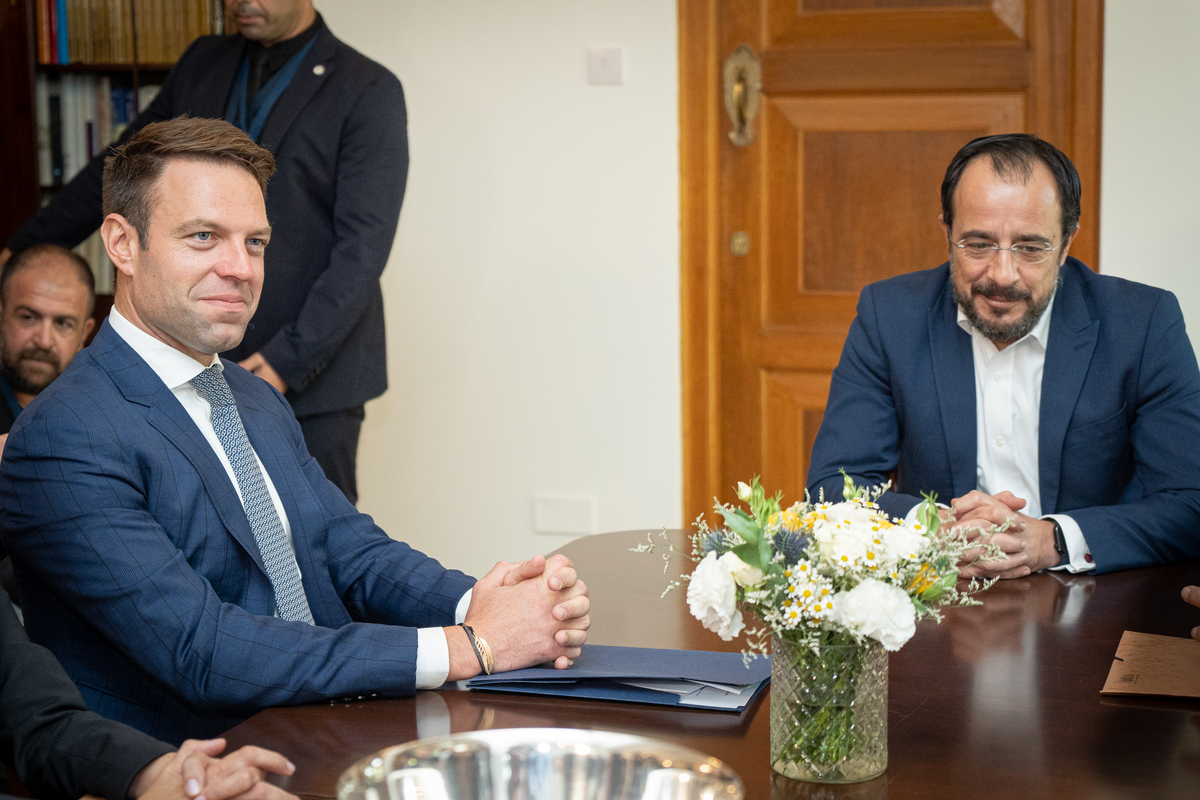 (ΞΕΝΗ ΔΗΜΟΣΙΕΥΣΗ) Ο πρόεδρος του ΣΥΡΙΖΑ Προοδευτική Συμμαχία Στέφανος Κασσελάκης συνομιλεί με τον Πρόεδρο της Κύπρου Νίκο Χριστοδουλίδη κατά τη διάρκεια συνάντησής τους στη Λευκωσία, Τετάρτη 4 Οκτωβρίου 2023. Ο πρόεδρος του ΣΥΡΙΖΑ - Προοδευτική Συμμαχία, Στέφανος Κασσελάκης, πραγματοποιεί επίσκεψη στη Λευκωσία έως τις 5 Οκτωβρίου, στο πλαίσιο της οποίας συναντάται με την πολιτειακή και πολιτική ηγεσία της Κυπριακής Δημοκρατίας. ΑΠΕ-ΜΠΕ/ΣΥΡΙΖΑ - Προοδευτική Συμμαχία/k vavaroutas
