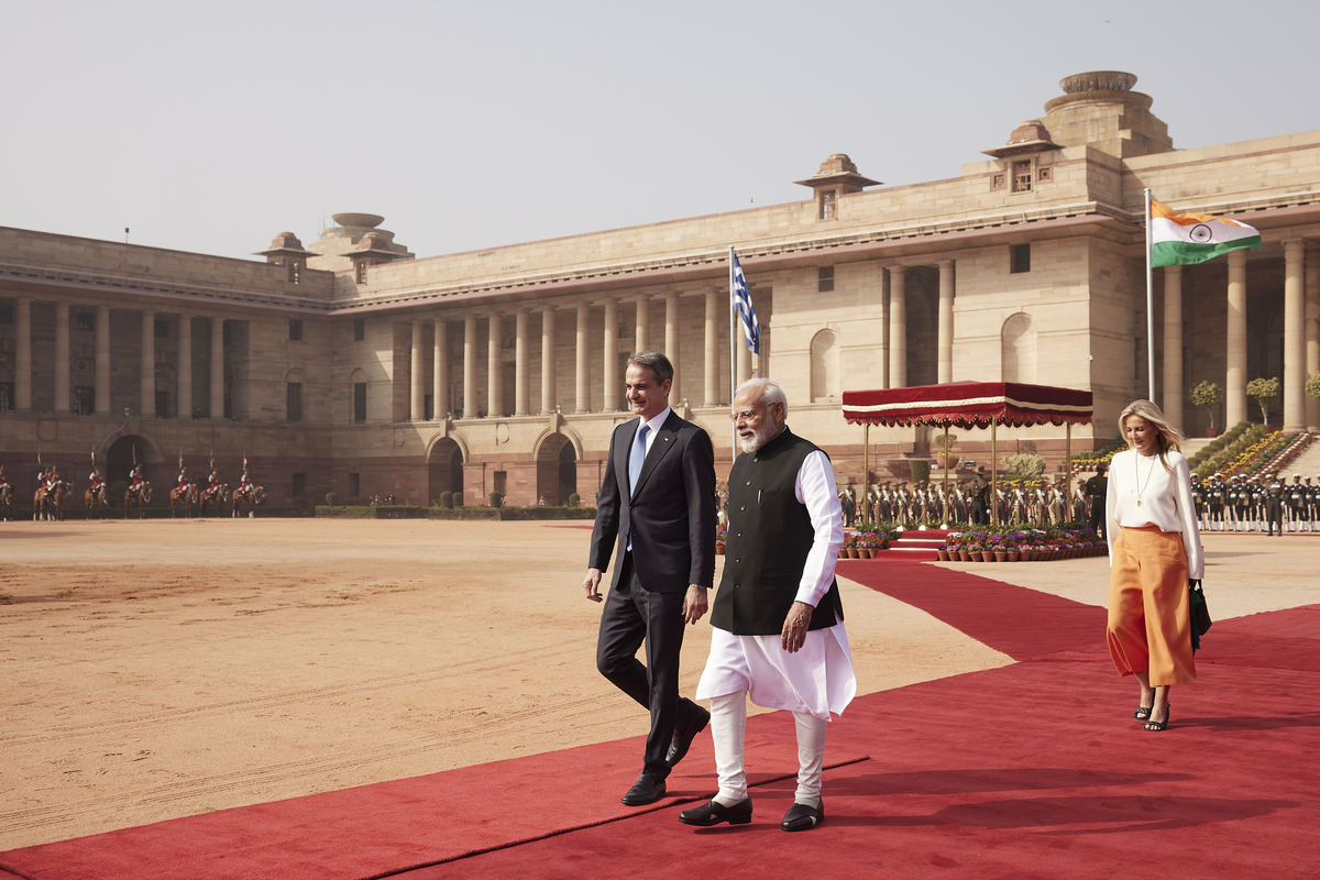 (Ξένη Δημοσίευση) Ο πρωθυπουργός της Ινδίας Narendra Modi υποδέχεται τον πρωθυπουργό Κυριάκο Μητσοτάκη και την σύζυγό του Μαρέβα Γκραμπόφσκι-Μητσοτάκη στο Rashtrapati Bhavan, Τετάρτη 21 Φεβρουαρίου 2024. Ο πρωθυπουργός Κυριάκος Μητσοτάκης πραγματοποιήσει επίσημη επίσκεψη στην Ινδία. ΑΠΕ-ΜΠΕ/ΓΡΑΦΕΙΟ ΤΥΠΟΥ ΠΡΩΘΥΠΟΥΡΓΟΥ/ΔΗΜΗΤΡΗΣ ΠΑΠΑΜΗΤΣΟΣ