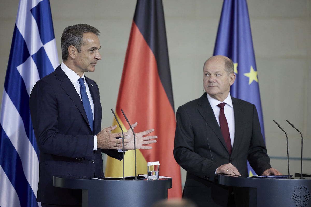 (ΞΕΝΗ ΔΗΜΟΣΙΕΥΣΗ). Ο πρωθυπουργός Κυριάκος Μητσοτάκης (A) κάνει από κοινού δηλώσεις μαζί με τον καγκελάριο της Γερμανίας Olaf Scholz (Δ), μετά το τέλος της συνάντησής τους στην Καγκελαρία, Βερολίνο, Τρίτη 14 Νοεμβρίου 2023. Ο πρωθυπουργός πραγματοποιεί επίσκεψη εργασίας στο Βερολίνο. ΑΠΕ-ΜΠΕ/ΓΡΑΦΕΙΟ ΤΥΠΟΥ ΠΡΩΘΥΠΟΥΡΓΟΥ/ΔΗΜΗΤΡΗΣ ΠΑΠΑΜΗΤΣΟΣ