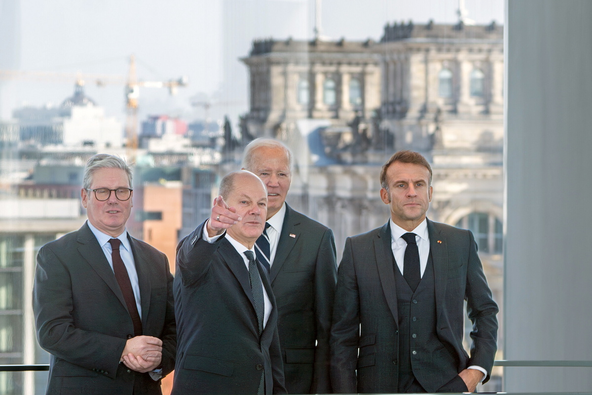 epa11666742 (L-R) British Prime Minister Keir Starmer, German Chancellor Olaf Scholz, US President Joe Biden and French President Emmanuel Macron attend a joint meeting in front of the Reichstag Building in Berlin, Germany, 18 October 2024. Biden is on a visit to Germany from 17 to 18 October 2024 to attend an Order of Merit ceremony and meet with the German chancellor, British prime minister, and French president. EPA/CHRIS EMIL JANSSEN / POOL