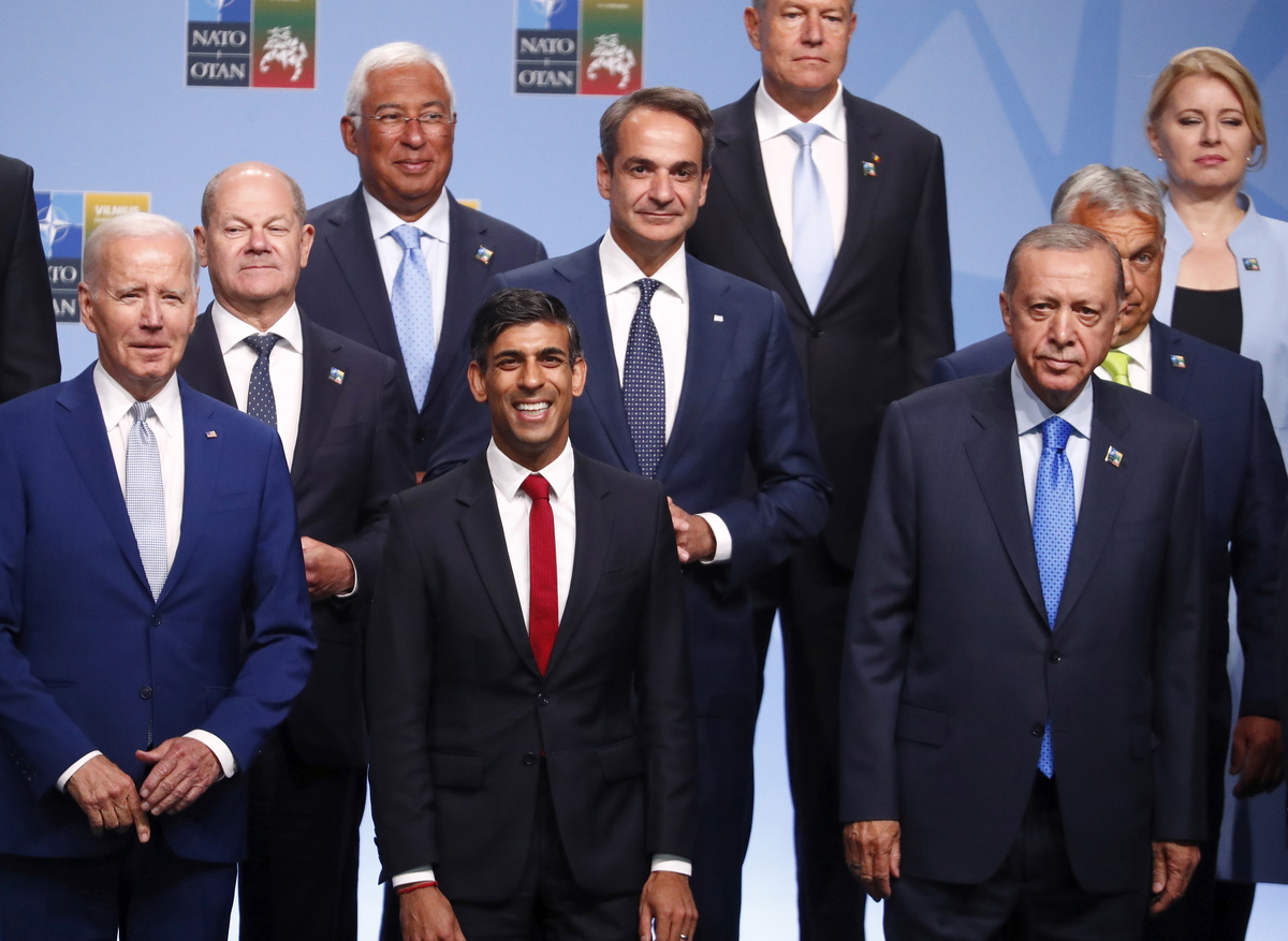 epa10739273 (L-R) US President Joe Biden, German Federal Chancellor Olaf Scholz, Portuguese Prime Minister Antonio Costa, Britain's Prime Minister Rishi Sunak, Greek Prime Minister Kyriakos Mitsotakis, the President of Romania Klaus Iohannis, the President of Turkiye Recep Tayyip Erdogan, Hungarian Prime Minister Victor Orban and Slovakia’s President Zuzana Caputova pose for the official group photoat the NATO summit in Vilnius, Lithuania, 11 July 2023. The North Atlantic Treaty Organization (NATO) Summit will take place in Vilnius on 11 and 12 July 2023 with the alliance's leaders expected to adopt new defence plans. EPA/TOMS KALNINS
