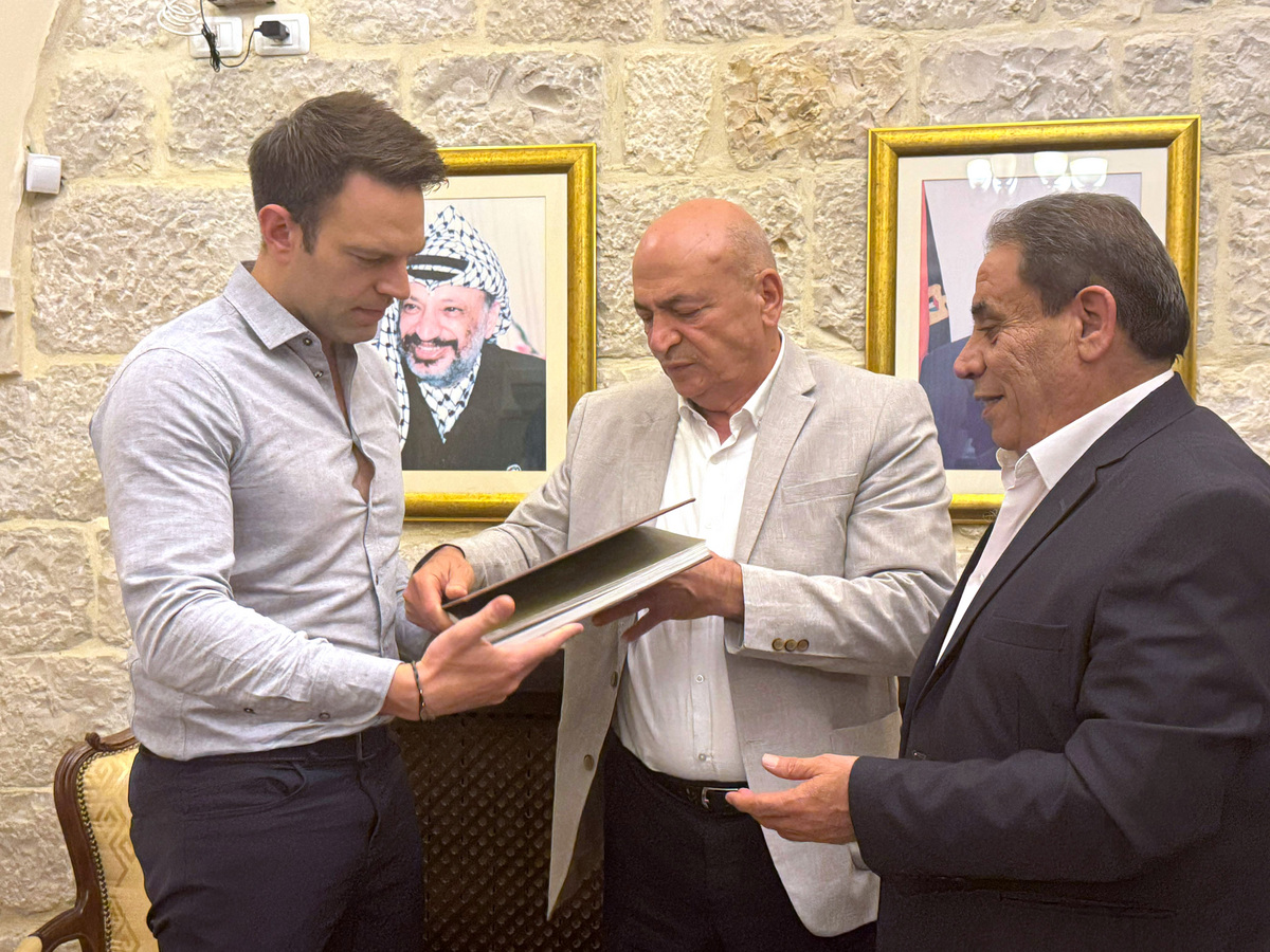 (Ξένη δημοσίευση) O πρόεδρος του ΣΥΡΙΖΑ- Προοδευτική Συμμαχία Στέφανος Κασσελάκης συναντάται με τον υπουργό Τουρισμού και Αρχαιοτήτων της Παλαιστίνης Hani Al-Hayek, στη Βηθλεέμ την Κυριακή 26 Μαΐου 2024. Επίσκεψη στην Παλαιστίνη πραγματοποιεί ο πρόεδρος του ΣΥΡΙΖΑ – ΠΣ, Στέφανος Κασσελάκης, το διάστημα 26-27/05/2024. Κατά την επίσκεψή του ο κος Κασσελάκης θα επισκεφθεί τα Ιεροσόλυμα, την Βηθλεέμ και την Ραμάλα, όπου και θα πραγματοποιήσει, μεταξύ άλλων συναντήσεις με μέλη του Υπουργικού Συμβουλίου της Παλαιστινιακής Αρχής, εκπροσώπους της ΟΑΠ (PLO) και την Α.Θ.Μ. Πατριάρχη της Αγίας Πόλεως Ιερουσαλήμ και πάσης Παλαιστίνης κ.κ. Θεόφιλο τον Γ’. Τον κο Κασσελάκη συνοδεύουν η Γραμματέας του ΣΥΡΙΖΑ – ΠΣ, κα Ράνια Σβίγκου, ο Τομεάρχης Άμυνας, κος Ευάγγελος Αποστολάκης, η Τομεάρχισα Εξωτερικών, κα Ρένα Δούρου και ο διπλωματικός του σύμβουλος κος Δημήτριος Παπαγεωργίου. ΑΠΕ-ΜΠΕ/ΓΡΑΦΕΙΟ ΤΥΠΟΥ ΣΥΡΙΖΑ/STR
