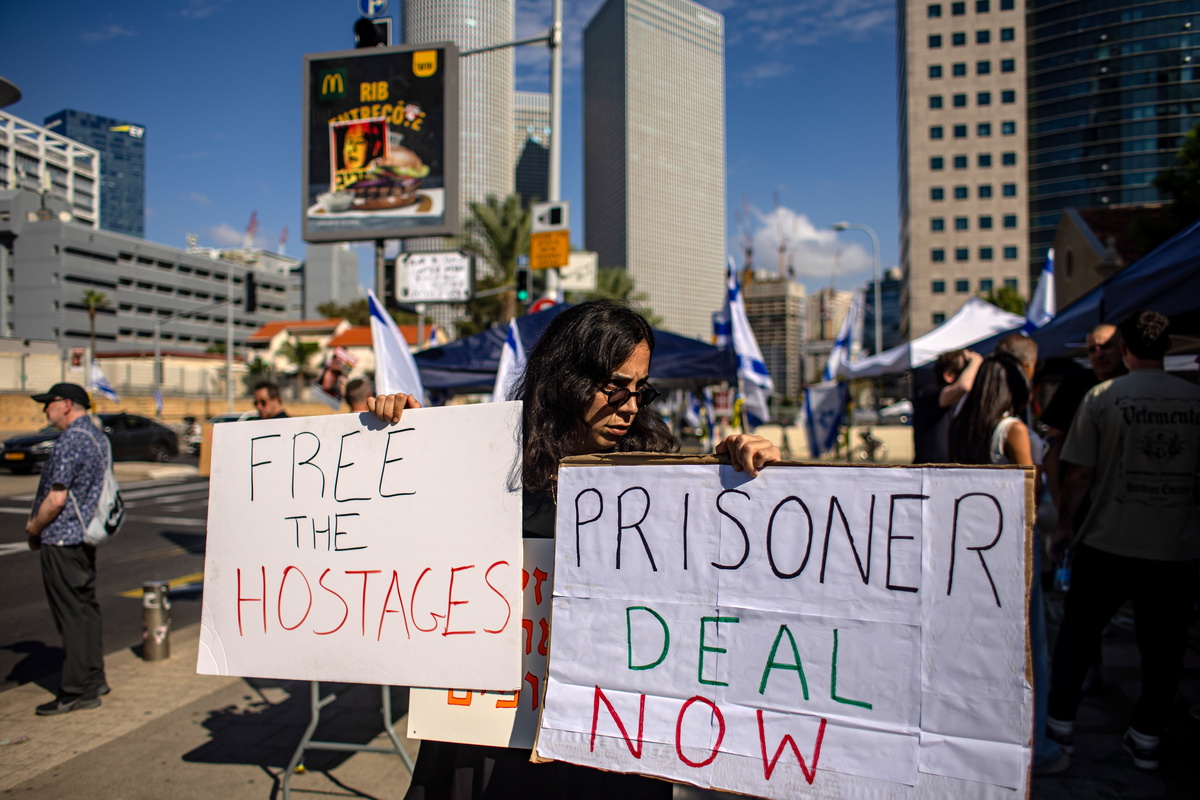 epa10925497 Friends and relatives of hostages held by Hamas militants in Gaza protest outside of the Israeli military base of The Kirya in Tel Aviv, Israel, 18 October 2023. More than 3,000 Palestinians and 1,400 Israelis have been killed according to the Israel Defense Forces (IDF) and the Palestinian Health authority since Hamas militants launched an attack against Israel from the Gaza Strip on 07 October. EPA/MARTIN DIVISEK