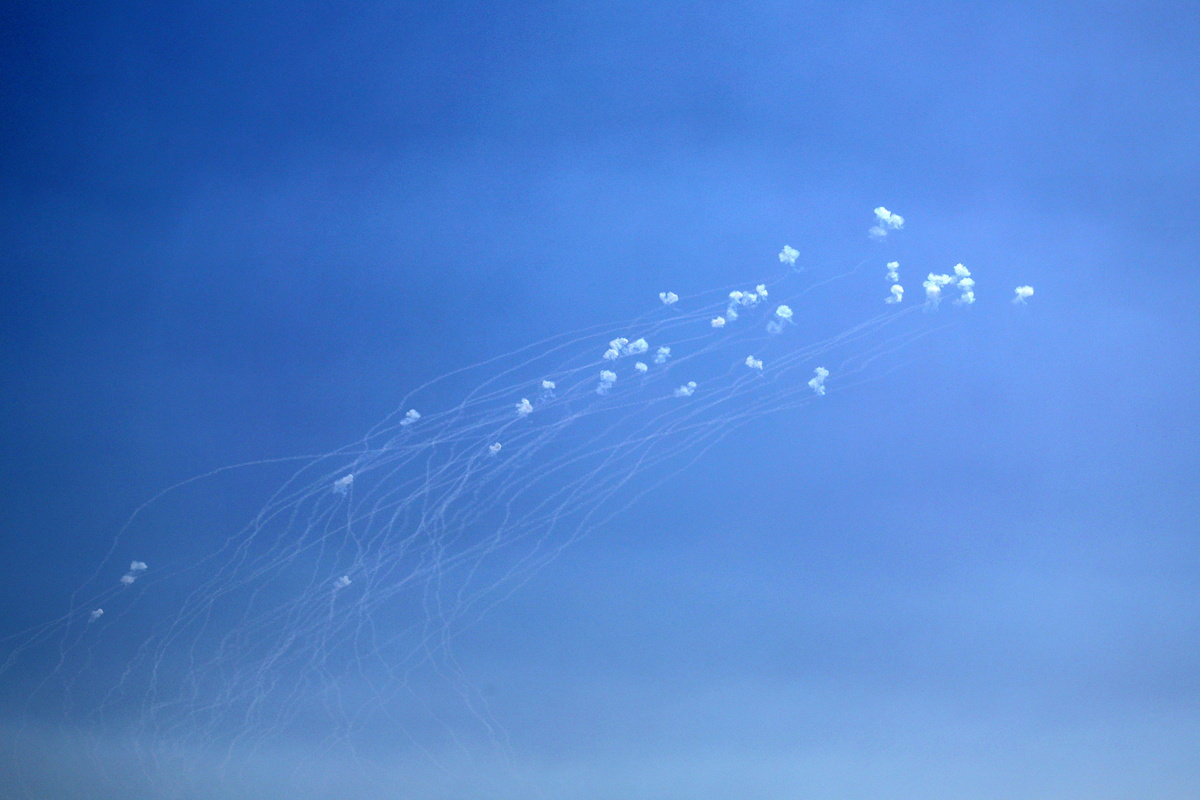 epa11622384 The Israeli 'Iron Dome' air defense system intercepts missiles fired from south Lebanon over the city of Safed in upper Galilee, northern Israel, 24 September 2024. According to the Israeli authorities, over 50 missiles were identified crossing from Lebanon into Israeli territory, and most of them were intercepted. Israel's army had struck Lebanon in the past 24h against what it said was 'dozens of Hezbollah targets in numerous areas in southern Lebanon'. The Lebanese Health Ministry said on 23 September that almost 500 people were killed following the Israeli strikes on Lebanon. EPA/ATEF SAFADI