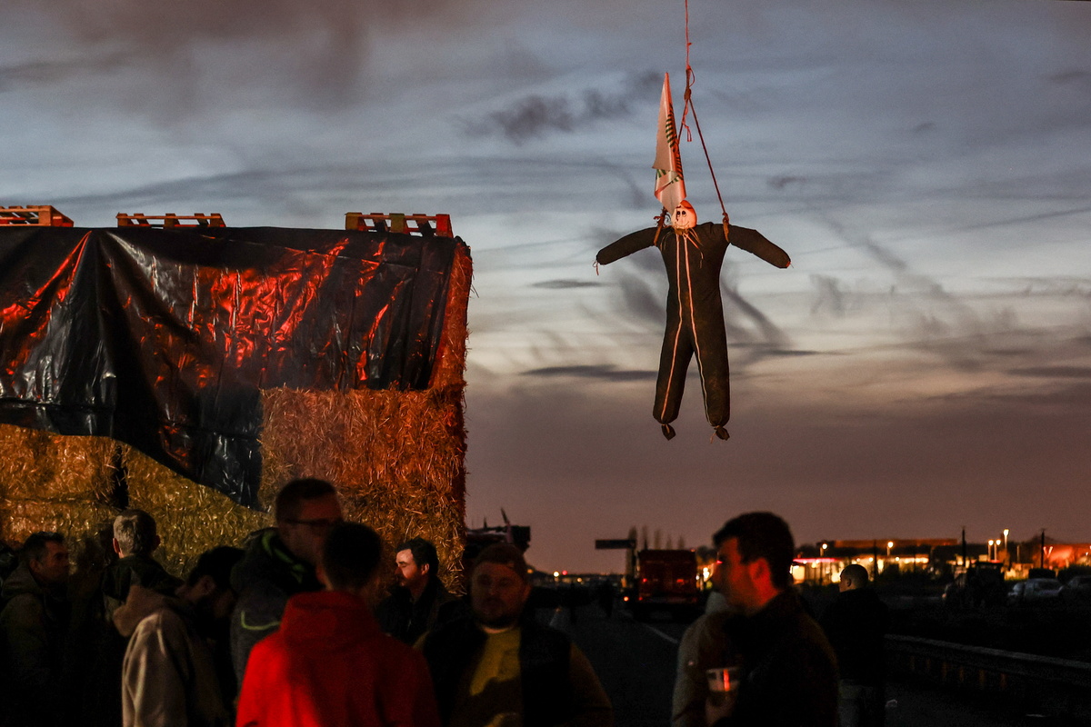 epa11112962 An effigy hangs from a bridge as people gather at a blockade point on the A4 highway at Jossigny, near of Paris, France, 29 January 2024. French farmers continue their protests with road blockades and demonstrations in front of state buildings awaiting a response from the government to their request for 'immediate' aid of several hundred million euros. On 23 January, the EU Agriculture and Fisheries Council highlighted the importance of providing the conditions necessary to enable EU farmers to ensure food security sustainably and profitably, as well as ensuring a fair income for farmers. EPA/MOHAMMED BADRA