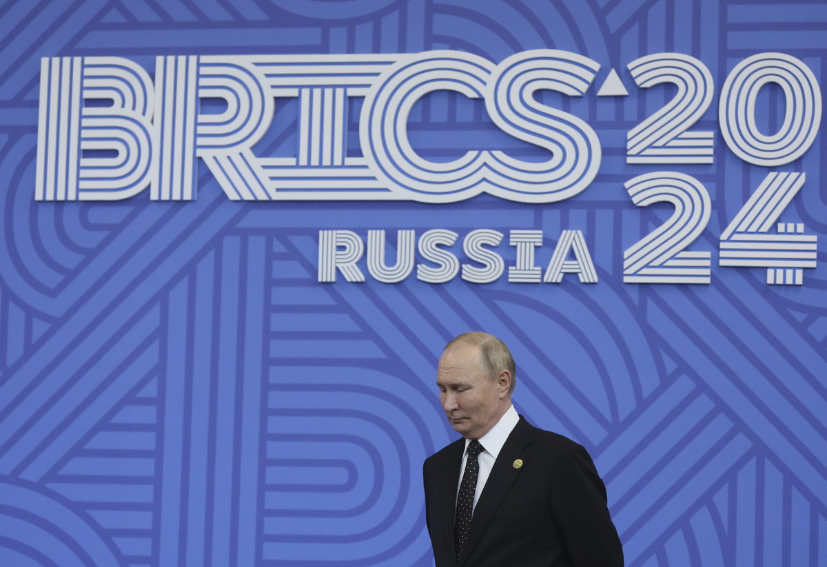 epa11678088 ussia's President Vladimir Putin takes part in an official welcoming ceremony for delegations' heads at the BRICS 2024 Summit in Kazan, Russia, 23 October 2024. The BRICS summit takes place from 22 to 24 October. EPA/MAXIM SHIPENKOV