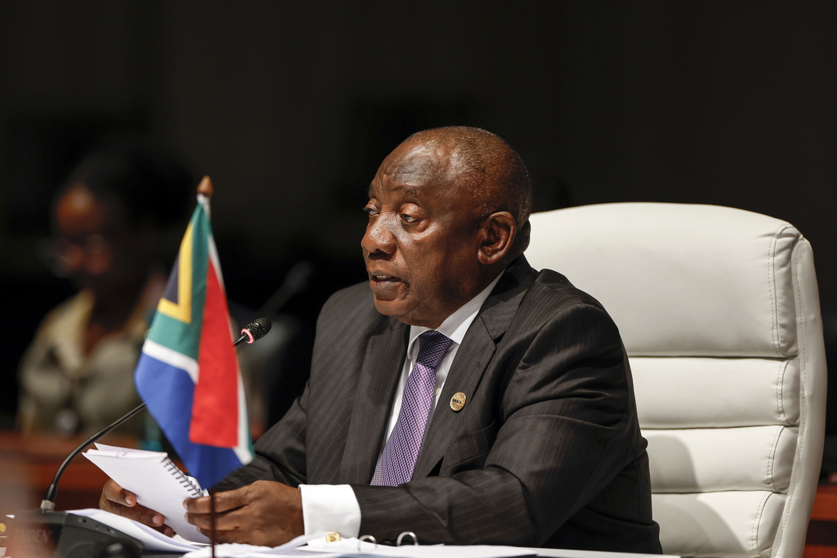 epa10815279 South African President Cyril Ramaphosa delivers his remarks at the plenary session during the 2023 BRICS Summit at the Sandton Convention Centre in Johannesburg, South Africa, 23 August 2023. South Africa is hosting the 15th BRICS Summit, (Brazil, Russia, India, China and South Africa), as the group’s economies account for a quarter of global gross domestic product. Dozens of leaders of other countries in Africa, Asia and the Middle East are also attending the summit. EPA/GIANLUIGI GUERCIA / POOL