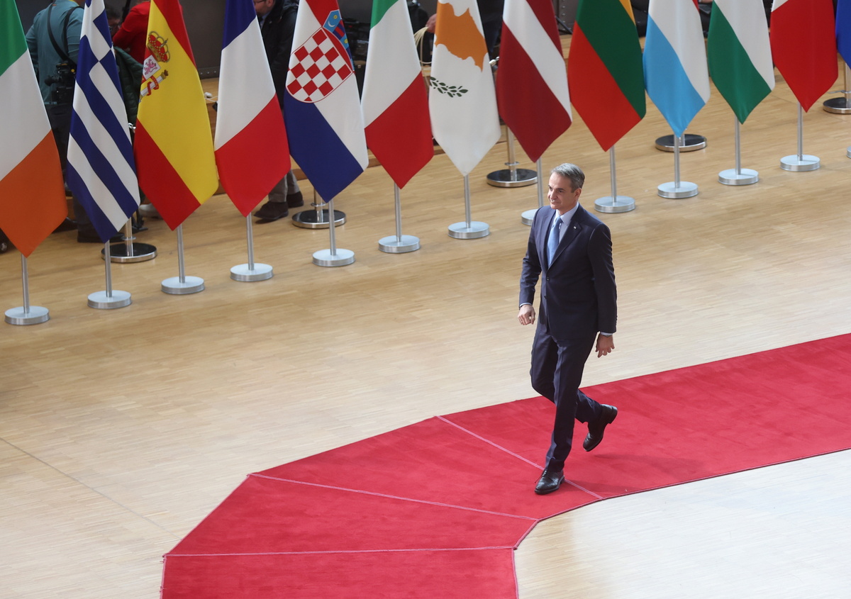 epa11233559 Greek Prime Minister Kyriakos Mitsotakis arrives to attend the European Council meeting in Brussels, Belgium, 21 March 2024. EU leaders are expected to address security and defence, continued support to Ukraine and the situation in the Middle-East as well as the EU's enlargement, external relations, migration, agriculture and the European Semester during a two-day summit. EPA/OLIVIER HOSLET