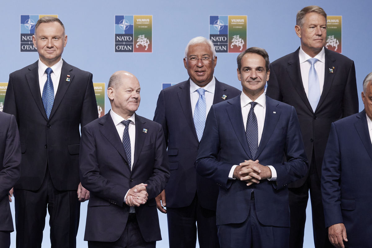 (ΞΕΝΗ ΔΗΜΟΣΙΕΥΣΗ) Ο πρωθυπουργός Κυριάκος Μητσοτάκης (Δ) συμμετέχει στην καθιερωμένη οικογενειακή φωτογραφία κατά τη διάρκεια της διήμερης Συνόδου Κορυφής του ΝΑΤΟ, στο Βίλνιους της Λιθουανίας, Τρίτη 11 Ιουλίου 2023. Η Σύνοδος Κορυφής αναμένεται να κρίνει την προσχώρηση ή μη στο Βορειοατλαντικό Σύμφωνο της Σουηδίας. Σήμερα το απόγευμα ο Κυριάκος Μητσοτάκης θα έχει κατ΄ ιδίαν συνάντηση με τον πρωθυπουργό της Αλβανίας Έντι Ράμα στην πρώτη τους επαφή μετά τη σοβαρή κρίση, που έχει προκαλέσει στις ελληνοαλβανικές σχέσεις, η σύλληψη του Φρέντη Μπελέρη. Ο πρωθυπουργός θα συναντηθεί επίσης με τον ομόλογο του Μαυροβουνίου. Σύμφωνα με κυβερνητικές πηγές ο Κυριάκος Μητσοτάκης θα συναντηθεί αύρο το πρωί στο περιθώριο της Συνόδου με τον Πρόεδρο της Γαλλίας Εμανουέλ Μακρόν. Επιπλέον, μετά τη συνάντηση, που θα έχει με τον Τούρκο πρόεδρο, Ρετζέπ Ταγίπ Ερντογάν, ο πρωθυπουργός θα συναντηθεί με τον Καγκελάριο της Γερμανίας Όλαφ Σολτς. ΑΠΕ-ΜΠΕ/ΓΡΑΦΕΙΟ ΤΥΠΟΥ ΠΡΩΘΥΠΟΥΡΓΟΥ/ΔΗΜΗΤΡΗΣ ΠΑΠΑΜΗΤΣΟΣ
