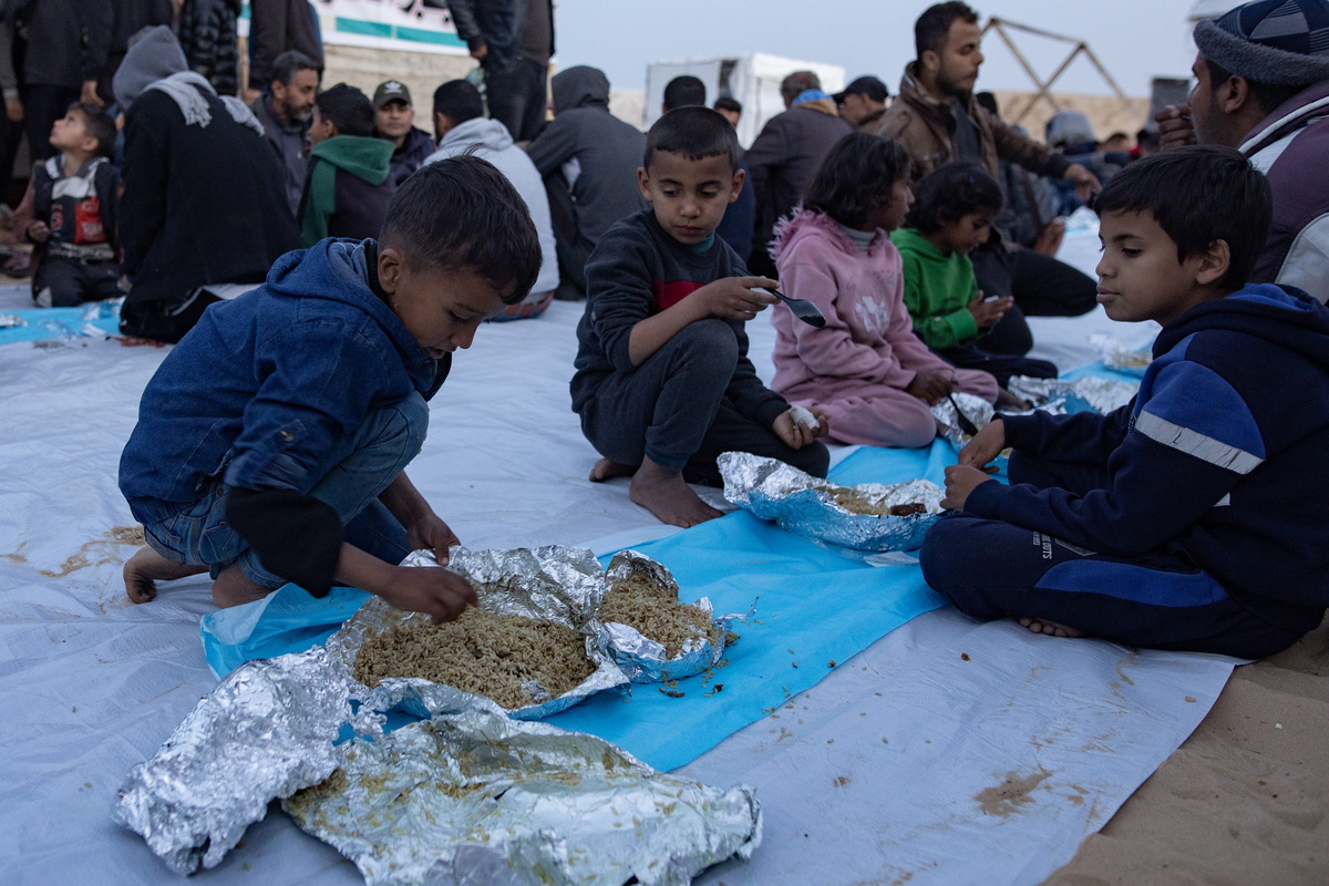 epa11245027 Displaced people sit together next to their tents to eat during the holy month of Ramadan at a collective Iftar meal organized by a youth volunteer group in a makeshift camp on the Egyptian border near Rafah, in the southern Gaza Strip, 26 March 2024. The Muslims' holy month of Ramadan is the ninth month in the Islamic calendar and it is believed that the revelation of the first verse in the Koran was during its last 10 nights. It is celebrated yearly by praying during the night time and abstaining from eating, drinking, and sexual acts during the period between sunrise and sunset. It is also a time for socializing, mainly in the evening after breaking the fast and a shift of all activities to late in the day in most countries. EPA/HAITHAM IMAD
