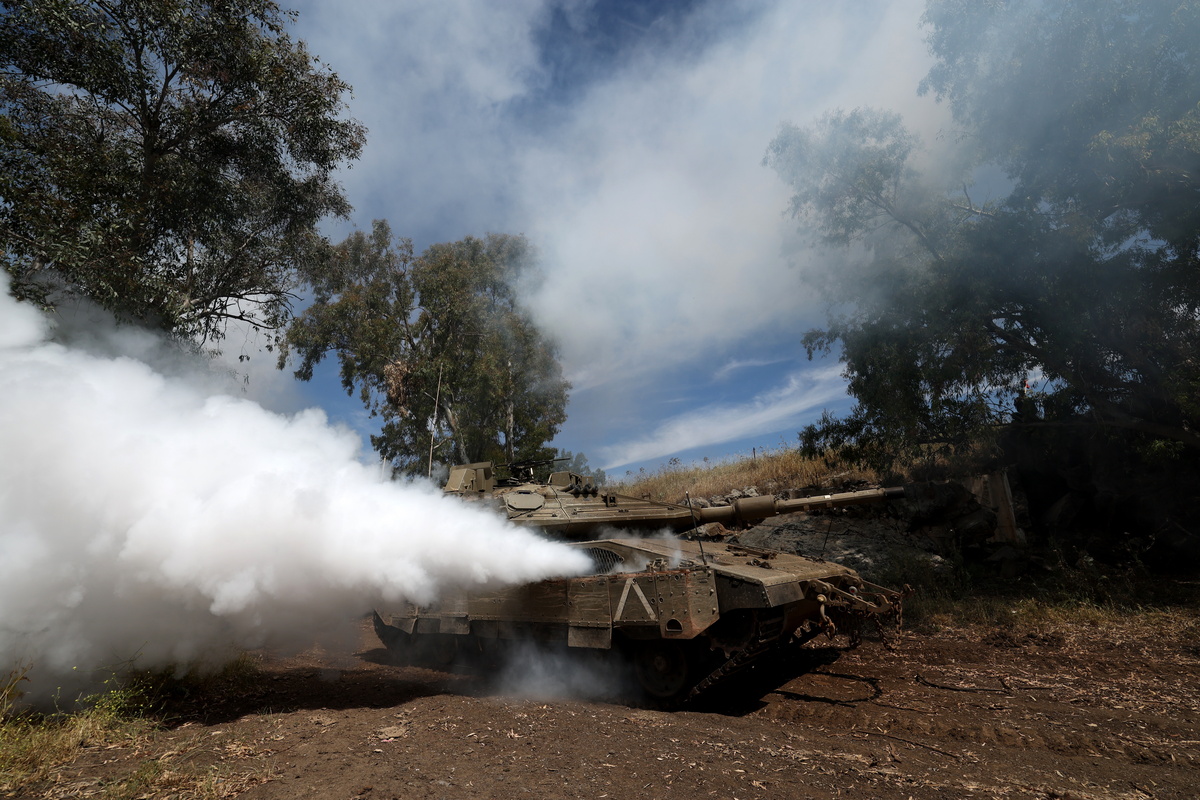 epa11326789 Israeli tanks of the 769 brigade operate in a training in the Golan Heights, next to the Israeli , Syrian and Lebanon border, 08 May 2024. Israeli Army spokesperson said that artillery and fighter jets struck over 20 Hezbollah targets in the area of Ramyeh in southern Lebanon, including military structures, and infrastructure. EPA/ATEF SAFADI
