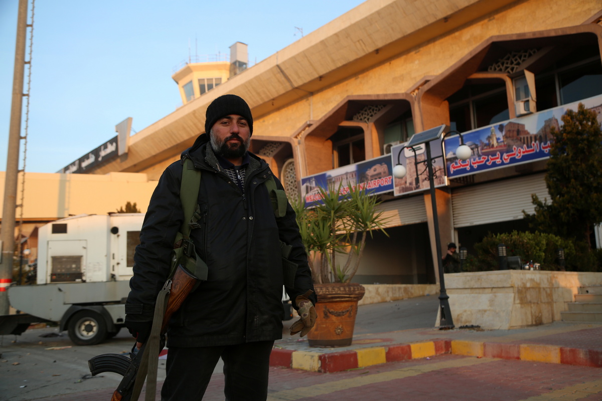 epa11752862 An armed man stands outside Aleppo International Airport in Aleppo, Syria, 02 December 2024. According to the Syrian Observatory for Human Rights (SOHR) on 30 November, militants opposing the Syrian government, seized Aleppo International Airport. Syrian opposition forces, led by the Islamist militant group Hayat Tahrir al-Sham (HTS) launched an offensive on 27 November, taking large parts of Aleppo, Syria's second-largest city. The offensive triggered counterattacks by the Syrian regime forces as well as Russian and Syrian airstrikes on opposition-controlled areas. More than 400 people, including civilians and militants have been killed since 27 November, SOHR stated, while the United Nations Office for the Coordination of Humanitarian Affairs (OCHA) stated that over 20,000 people have been internally displaced within Aleppo and to other governorates. EPA/BILAL AL HAMMOUD