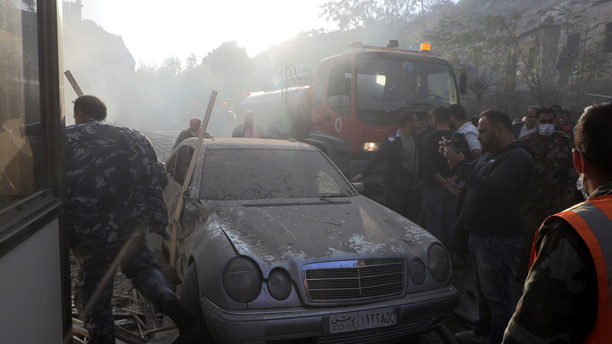 epaselect epa11720974 Syrian security forces inspect the damage at the scene of an airstrike in the Al-Mazzeh neighborhood of Damascus, Syria, 14 November 2024. At least 15 people were killed and dozens of others injured after Israeli airstrikes hit the suburbs of Mazzeh and Qudsaya, in the west of Damascus, Syrian state news agency SANA reported quoting military sources. Israel's military stated that they targeted 'infrastructure sites and command centers' belonging to the Islamic Jihad organization in Syria. EPA/STRINGER