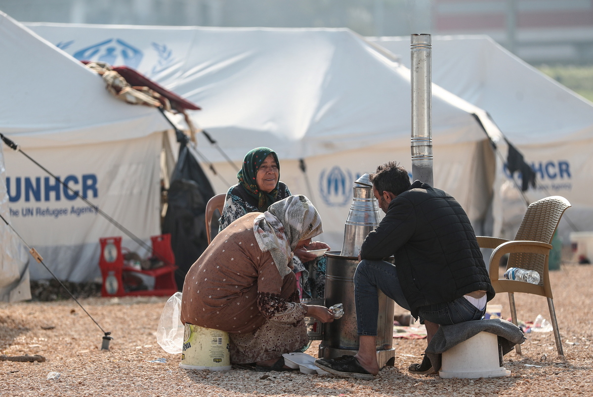 epa10487841 People sit around a stove in a makeshift camp in the aftermath of powerful earthquakes in Hatay, Turkey, 24 February 2023. More than 46,000 people died and thousands more were injured after major earthquakes struck southern Turkey and northern Syria on 06 February and again on 20 February. EPA/ERDEM SAHIN
