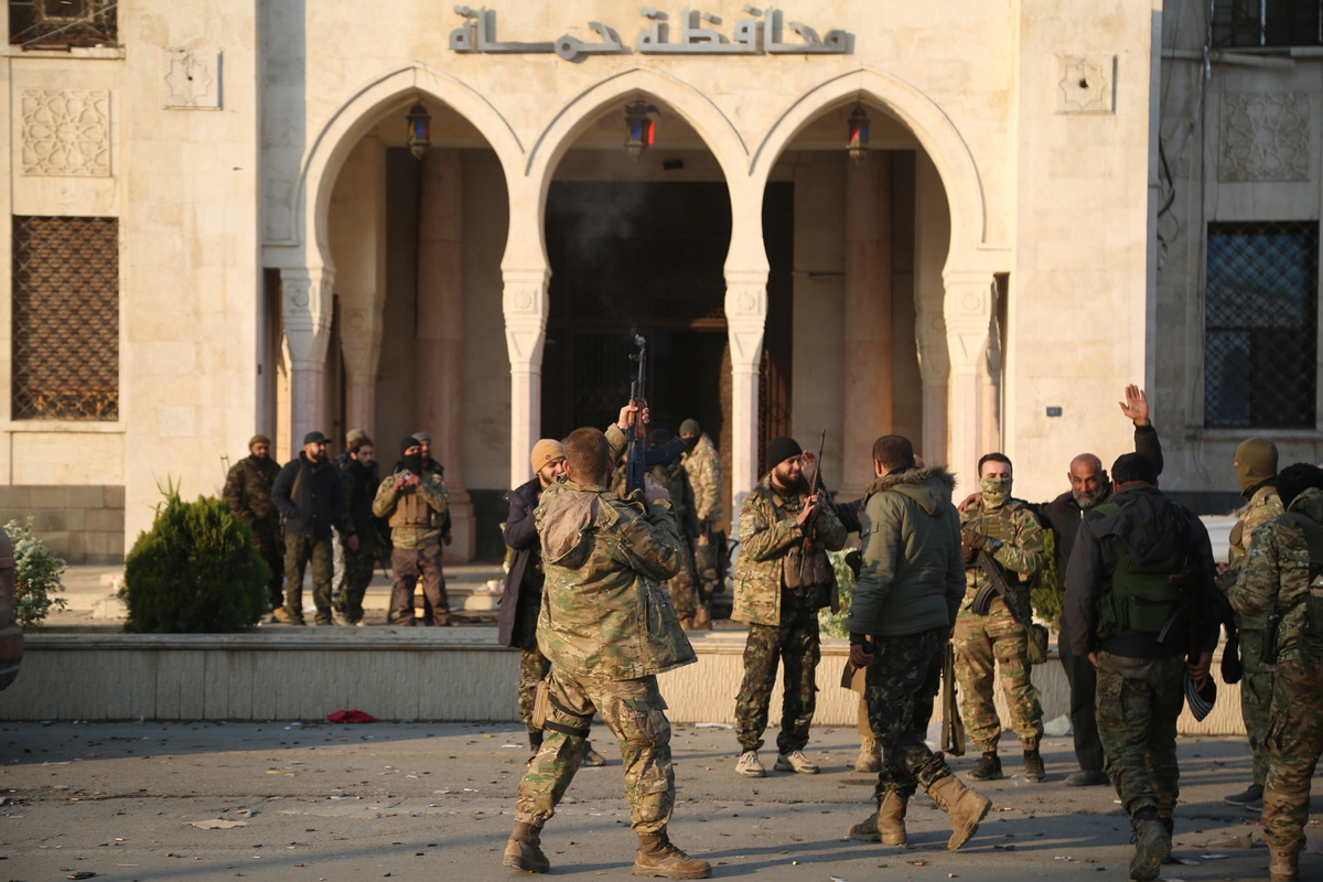 epaselect epa11760242 Opposition fighters fire their guns in the air in celebration in front of a Syrian government building after they entered the city of Hama, Syria, 06 December 2024. Syrian opposition forces, led by the Islamist militant group Hayat Tahrir al-Sham (HTS), launched an offensive on 27 November, triggering counterattacks by the Syrian regime forces as well as Russian and Syrian airstrikes on opposition-controlled areas. According to Hay'at Tahrir Al-Sham leader Abu Mohammad Al-Jolani, there will be 'no revenge' after opposition groups entered the strategically important Syrian city of Hama on 05 December. EPA/BILAL AL HAMMOUD