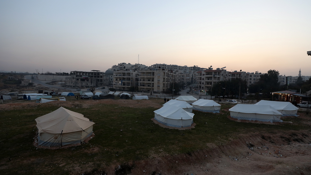 epa10495787 Tents are erected in a public space near buildings affected by the powerful earthquakes in Idlib, Syria, 28 February 2023. Several people continue to spend the nights in tents erected on the streets and in public gardens as they fear aftershocks or their homes were affected by the earthquakes that struck southern Turkey and northern Syria on 06 February and again on 20 February. More than 46,000 people died and thousands more were injured due to the earthquakes. EPA/YAHYA NEMAH
