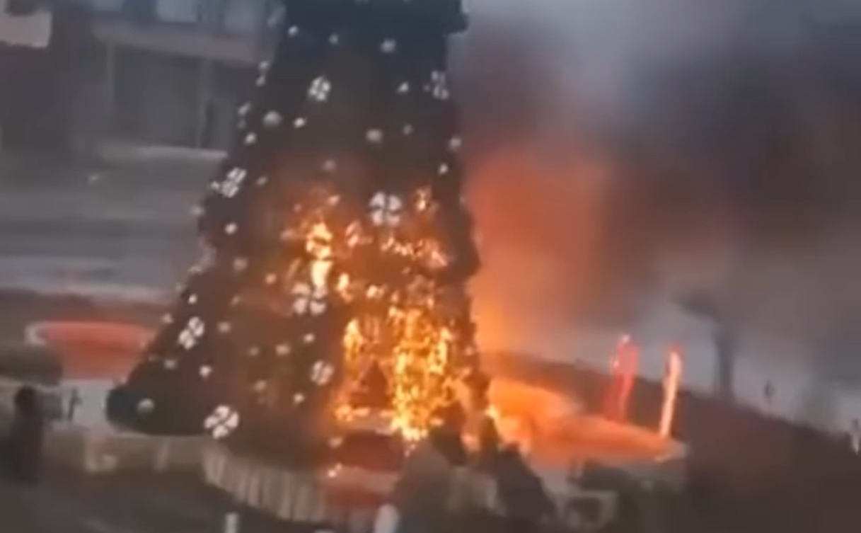 «Το δέντρο θα αντικατασταθεί και θα ανάψουν τα λαμπάκια ως αύριο το πρωί», προσθέτει έχοντας στο πλάι του χριστιανούς ιερωμένους, επευφημούμενος από κατοίκους.