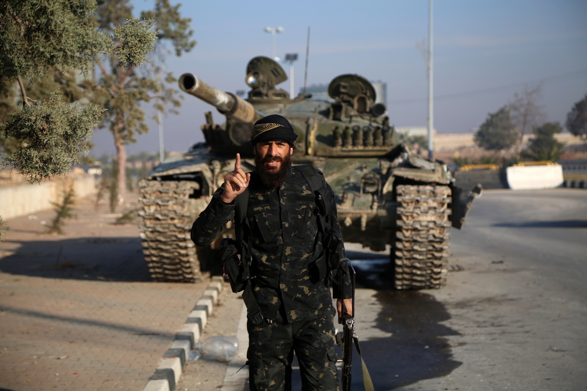 epa11752876 An armed man poses for a photo in front of a tank after rebel forces took control of the city, in Aleppo, Syria, 02 December 2024. According to the Syrian Observatory for Human Rights (SOHR) on 30 November, militants opposing the Syrian government, seized Aleppo International Airport. Syrian opposition forces, led by the Islamist militant group Hayat Tahrir al-Sham (HTS) launched an offensive on 27 November, taking large parts of Aleppo, Syria's second-largest city. The offensive triggered counterattacks by the Syrian regime forces as well as Russian and Syrian airstrikes on opposition-controlled areas. More than 400 people, including civilians and militants have been killed since 27 November, SOHR stated, while the United Nations Office for the Coordination of Humanitarian Affairs (OCHA) stated that over 20,000 people have been internally displaced within Aleppo and to other governorates. EPA/BILAL AL HAMMOUD