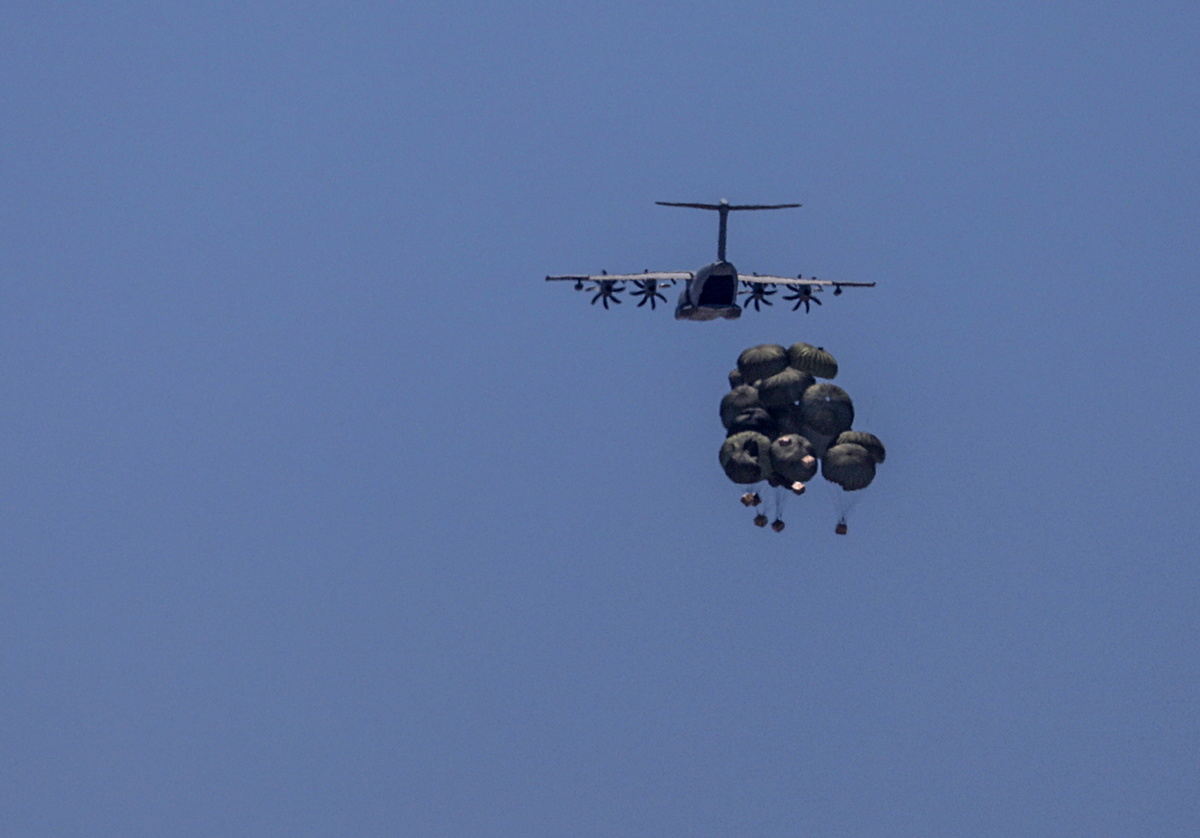 epa11346912 An international plane drops humanitarian aid over the city of Khan Younis, southern Gaza Strip, 17 May 2024. The international community is combining efforts to increase humanitarian assistance to the residents of Gaza affected by the ongoing conflict. More than 35,100 Palestinians and over 1,455 Israelis have been killed, according to the Palestinian Health Ministry and the Israel Defense Forces (IDF), since Hamas militants launched an attack against Israel from the Gaza Strip on 07 October 2023, and the Israeli operations in Gaza and the West Bank which followed it. EPA/MOHAMMED SABER