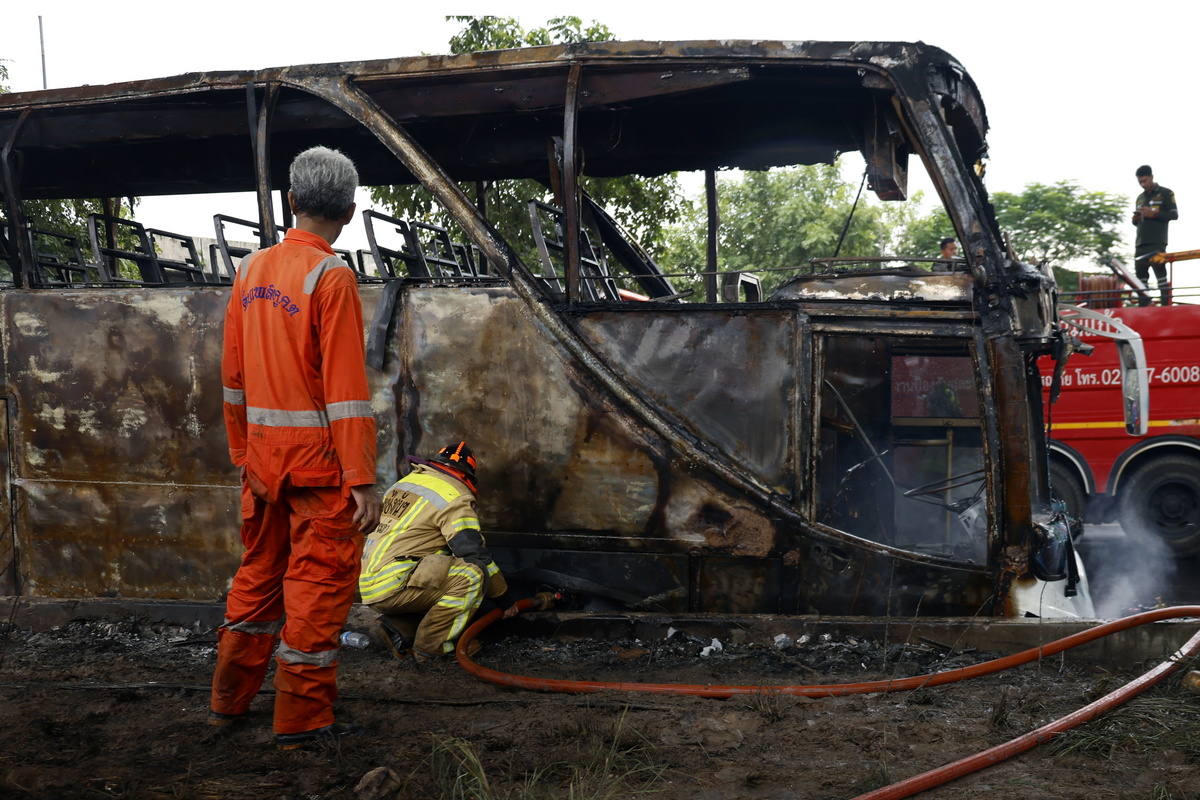 epa11634784 First response teams inspect a burnt bus on Vibhavadi Rangsit road in Bangkok, Thailand, 01 October 2024. At least 10 students were killed in the accident and many others were injured, police said. EPA/NARONG SANGNAK