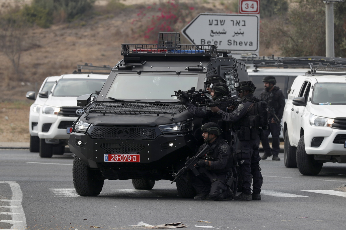 epa10907777 Israeli soldiers take position on the main road near the border with Gaza, 08 October 2023. Israel announced initiating a large-scale operation 'Swords of Iron' after surprise attacks on Israel on 07 October claimed by the Islamist movement Hamas killed more than 670 Israelis and left over 2,100 injured in the attacks, the Israeli army said 08 October. EPA/ATEF SAFADI