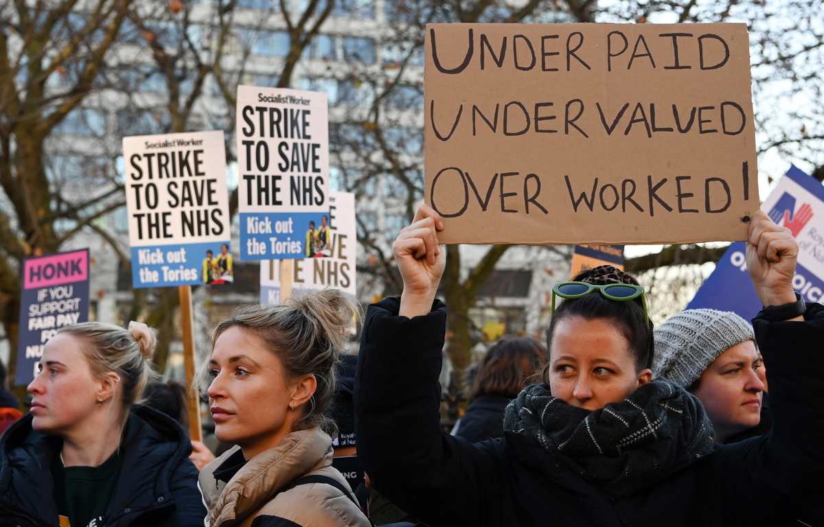 epa10367199 NHS nurses rally outside St.Thomas' Hospital in London, Britain, 15 December 2022. NHS nurses in Britain have gone on strike making it the largest strike in NHS history. Tens of thousands of nurses have walked out in a dispute over pay and conditions. Meanwhile thousands of operations have been canceled due to the strikes that will cause chaos to the NHS over the festive period. EPA/ANDY RAIN