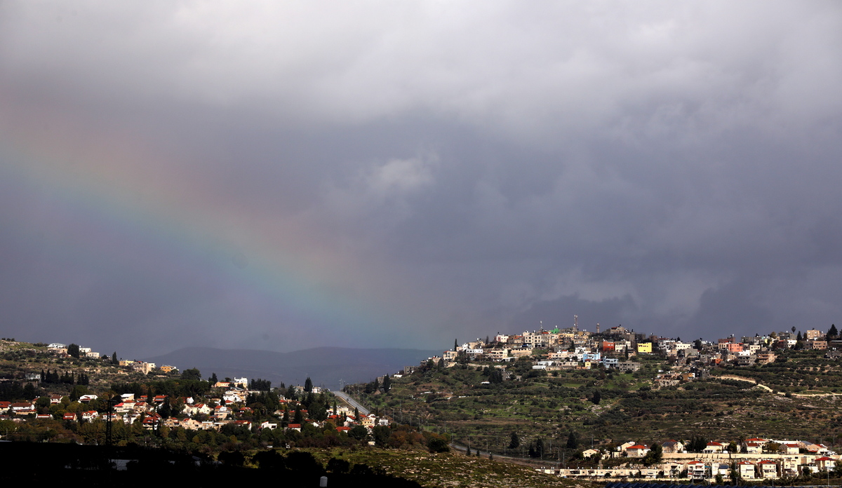 epa08973169 A rainbow is seen during rainy and cold weather over the Palestinian village of Jet (R) and jewish settelment of Qadomim (L) near the West Bank city of Nablus, 29 January 2021. EPA/ALAA BADARNEH