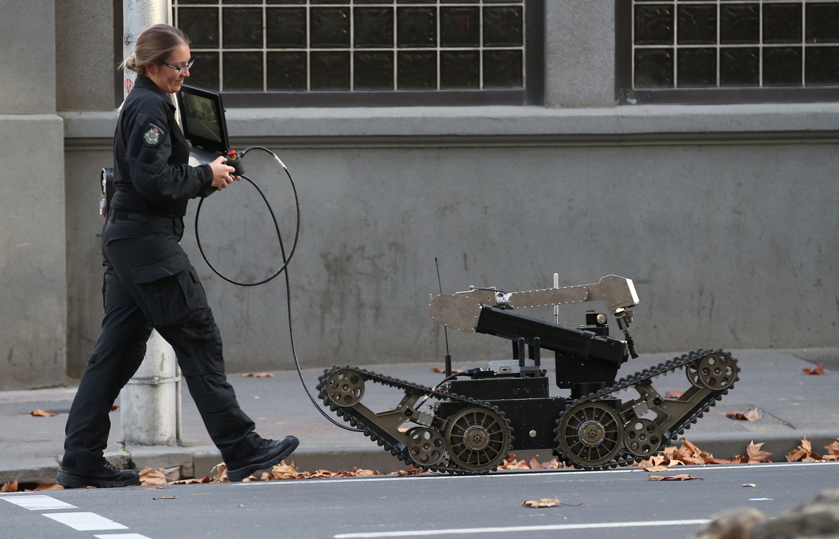 epa06764095 A Victoria Police officer controls a bomb disposal robot at Lonsdale Street near the Magistrates Court in Melbourne, Victoria, Australia, 26 May 2018. The bomb squad has been called after a suspicious item was found on a bus at the intersection of King and Lonsdale Streets. After security checks the police gave an all-clear and deemed the area safe. EPA/DAVID CROSLING AUSTRALIA AND NEW ZEALAND OUT