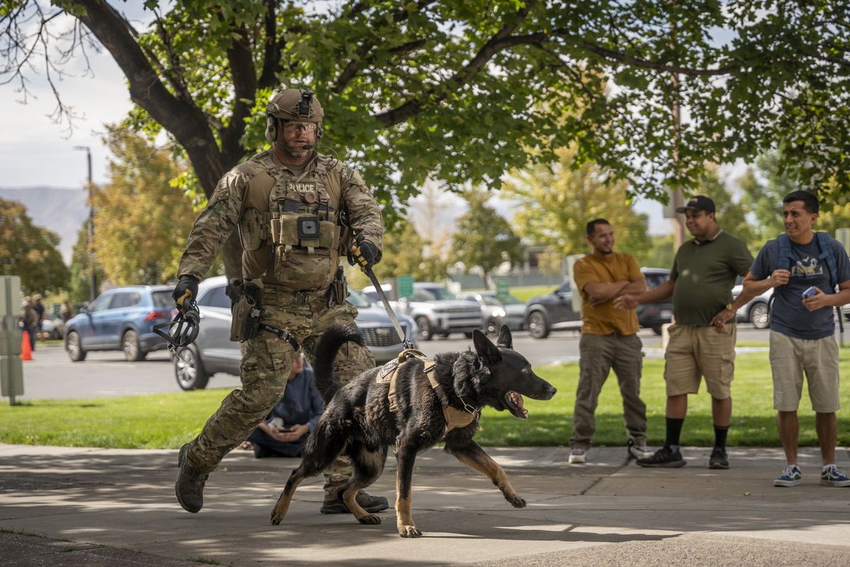 epaselect epa12368534 A police officer walks with a K9 Unit following the shooting of Charlie Kirk, the CEO and co-founder of the conservative youth organization Turning Point USA, at Utah Valley University in Orem, Utah, USA, 10 September 2025. Kirk was shot at an event he was hosting at Utah Valley University and was removed from the premises by his security team, he later died in the hospital. A suspect is in custody. EPA/MARIELLE SCOTT