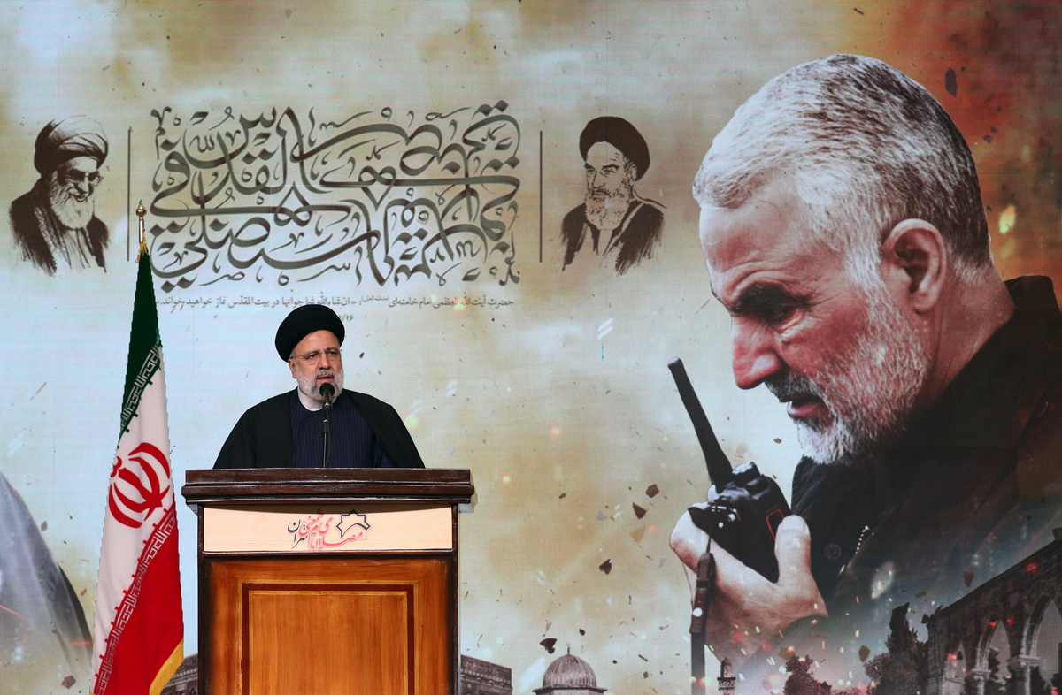 epa11055605 Iranian president Ebrahim Raisi speaks to the crowd in front of an image of the late Iran's Islamic Revolutionary Guard Corps (IRGC) Quds Force commander Qasem Soleimani during the fourth anniversary of his death, in Tehran, Iran, 03 January 2024. On the fourth anniversary of the assassination of Iranian General Qasem Soleimani, two explosions have killed at least 103 people and another 171 people were wounded near the mausoleum dedicated to him, according to Iranian state television. As part of a ceremony to honor General Soleimani, who was killed in a drone strike in neighboring Iraq in 2020, hundreds of people were on their way towards the grave on 03 January. EPA/ABEDIN TAHERKENAREH EPA-EFE/ABEDIN TAHERKENAREH