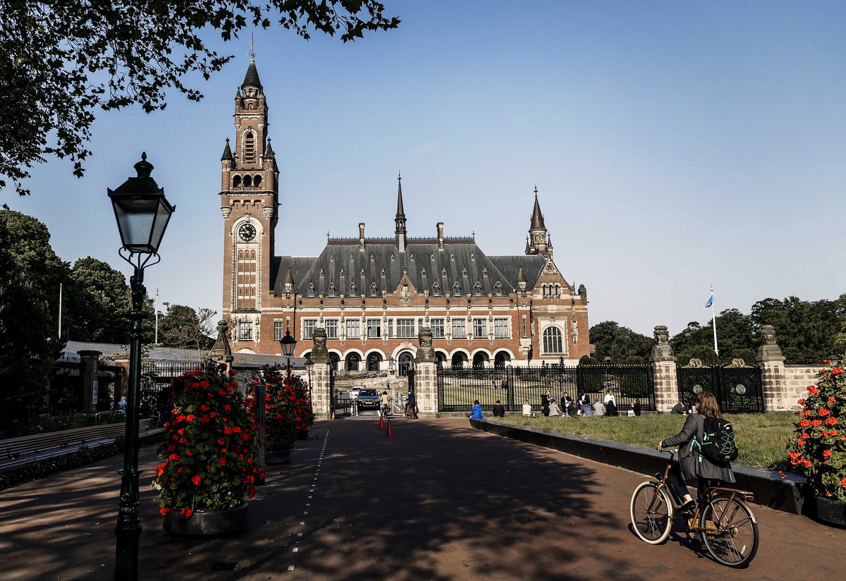 epa10675545 A general view on the Peace Palace prior to a public hearing in Ukraine against Russia at the International Court of Justice, the Hague, the Netherlands, 06 June 2023. Ukraine's side has presented its arguments at the start of a four days hearings in the case against Russia about the occupation of eastern Ukraine and Crimea. EPA/REMKO DE WAAL