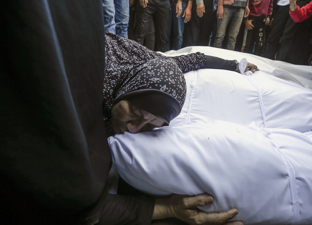 epa11725873 A woman mourns over the covered bodies of members of the Abu Irmana family, killed on 16 November in an Israeli airstrike in the west of the Al-Nusairat refugee camp, during their funeral at the Al-Aqsa Martyrs hospital in Deir Al Balah, central Gaza Strip, 17 November 2024. More than 43,800 Palestinians, including over 13,000 children, have been killed according to the Palestinian Ministry of Health and over 1,400 Israelis have been killed according to the Israel Defense Forces (IDF), since Hamas militants launched an attack against Israel from the Gaza Strip on 07 October 2023, and the Israeli operations in Gaza and the West Bank which followed it. EPA/MOHAMMED SABER