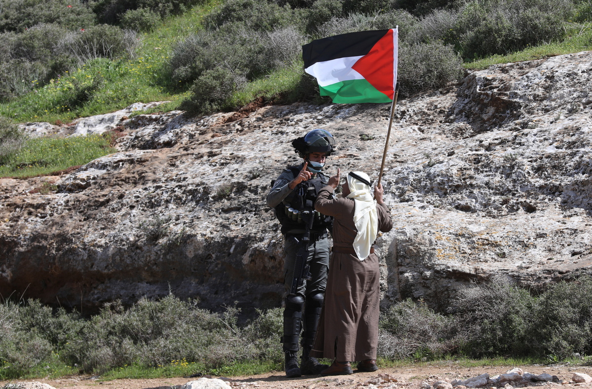 epaselect epa09054180 A Palestinian argues with an Israeli soldier during a demonstration against Israeli settlements in the village of Bet Dajan, near the northern West Bank city of Nablus, 05 March 2021. EPA/ALAA BADARNEH