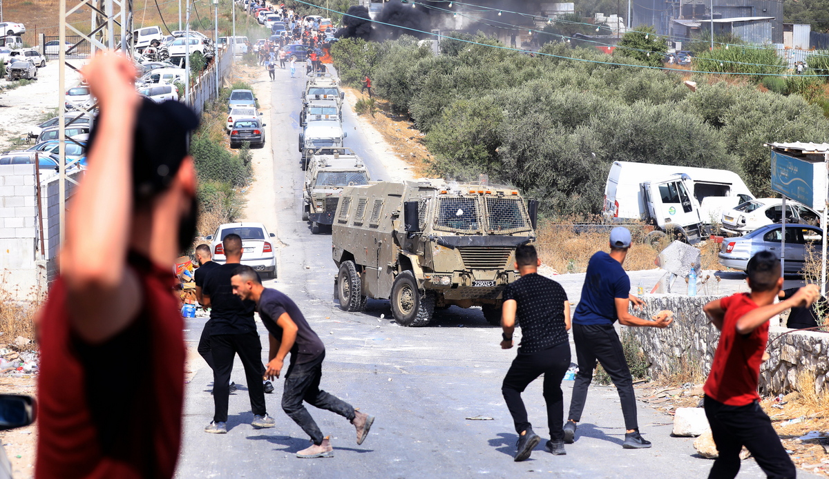 epa10146954 Palestinians hurl stones at Israeli troops during an Israeli operation to arrest Palestinian militants at Rojeeb village near the West Bank city of Nablus, 30 August 2022. Two Palestinian militants were arrested and another 50 were wounded during the opearation. EPA/ALAA BADARNEH