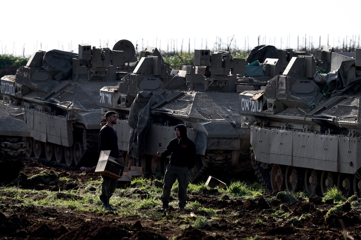 epa12799392 Israeli tanks gather on the Israeli border with Lebenon, northern Israel, 06 March 2026. The Israeli military stated it is conducting strikes across Lebanon targeting Hezbollah infrastructure and personnel. EPA/ATEF SAFADI