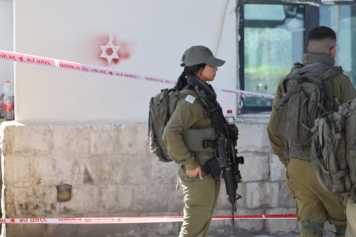 epa11217763 Israeli forces secure the site of a stabbing attack at a checkpoint, west of Bethlehem, West Bank, 13 March 2024. Two Israelis were injured in the stabbing and the attacker was shot by police, according to Magen David Adom (MDA) organization. EPA/ABIR SULTAN