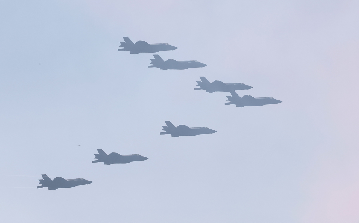 epa10217062 F-35A fighter jets fly in formation in skies above the Gyeryongdae military headquarters, 160 kilometers south of Seoul, South Korea, 01 October 2022, for an Armed Forces Day event. EPA/YONHAP SOUTH KOREA OUT