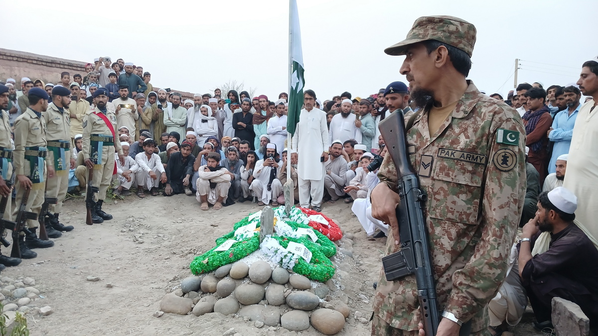 epa12081584 Pakistani Army soldiers and civilians attend the funeral of soldier Muhammad Kashif, killed in an IED blast in restive Balochistan province, in Kohat, Pakistan, 07 May 2025. An IED blast in restive Balochistan killed seven Pakistani soldiers and injured five others, with the Baloch Liberation Army (BLA) claiming responsibility. The attack comes amid rising tensions between Pakistan and India, following recent violent incidents including a deadly train hijacking by the BLA and a mass shooting in Pahalgam. EPA/BASIT GILANI