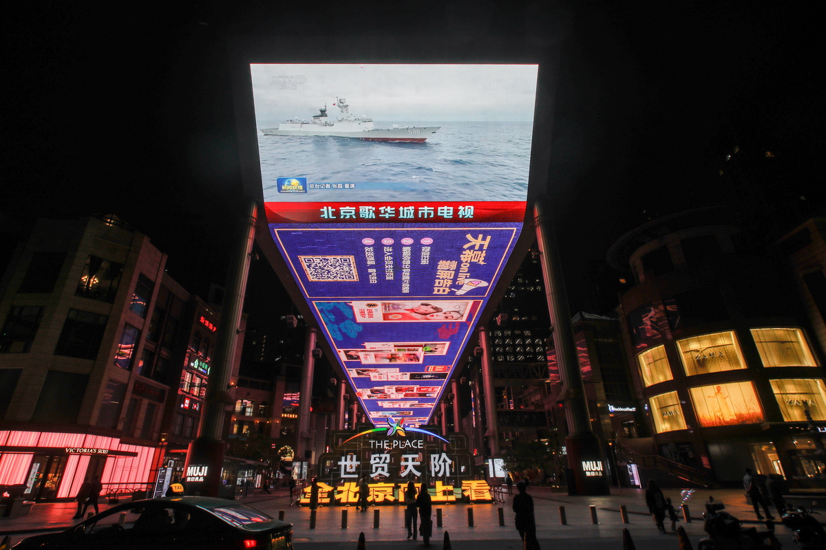 epa10567247 A screen shows evening news of China conducting live fire drill around Taiwan in Beijing, China, 10 April 2023. China is conducting three days of military drills around the Taiwan Strait following the Taiwanese president's meeting in the United States with the US Speaker of the House of Representatives. The People's Liberation Army is holding a military exercise in the Fujian Province, Pingtan County, the closest point to Taiwan. EPA/WU HAO