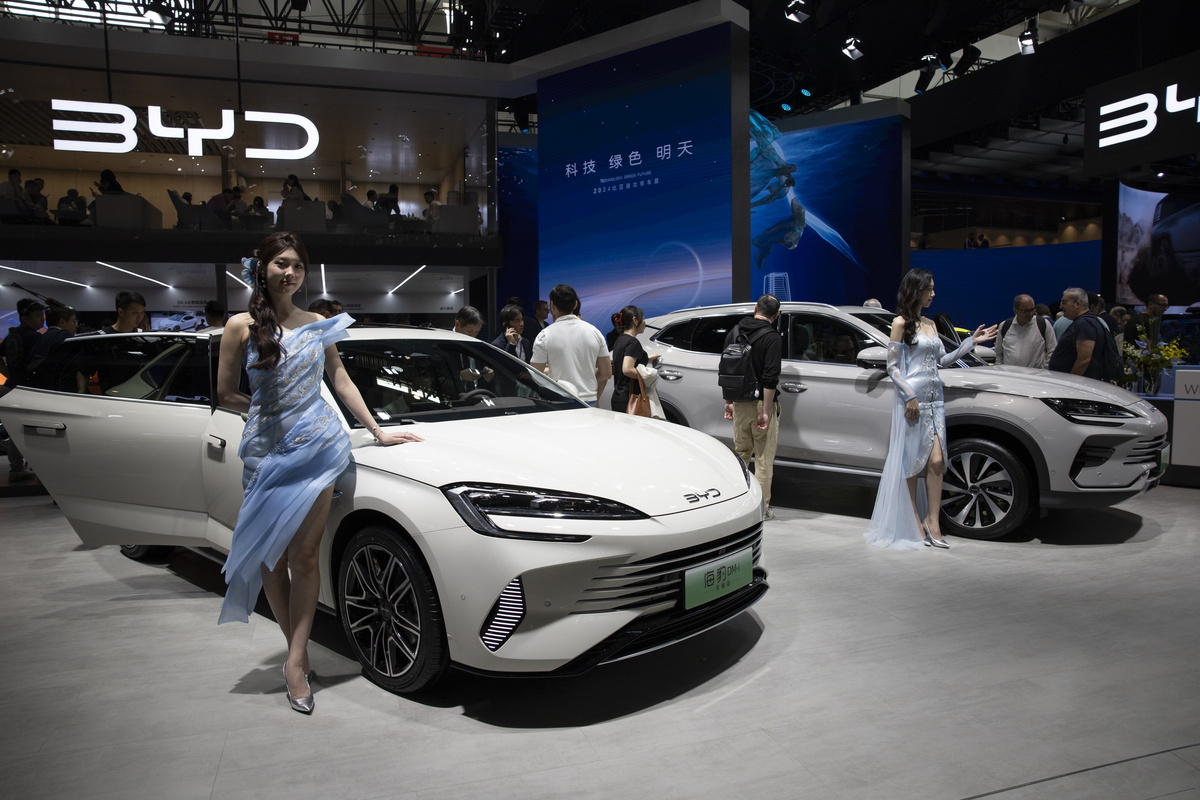 epa11299490 Brand models pose next to BYD cars, during the opening day of 2024 Beijing International Automotive Exhibition in Beijing, China, 25 April 2024. 2024 Beijing International Automotive Exhibition will be held until 04 May. EPA/ANDRES MARTINEZ CASARES