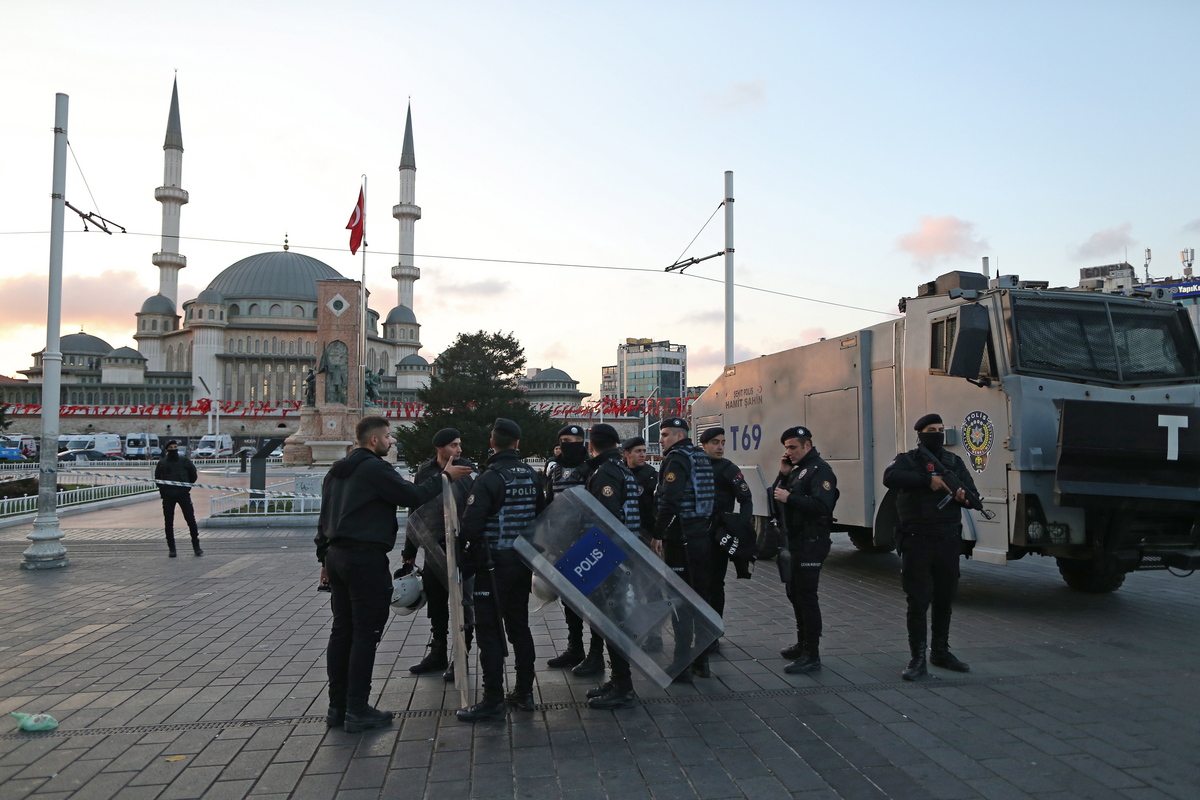 epa10303651 Turkish policemen try to secure the area in front of Taksim Mosque after an explosion at Istiklal Street, in Istanbul, Turkey 13 November 2022. According to governor Ali Yerlikaya, an explosion that occurred at roughly 4.20 p.m. local time has resulted in losses and injuries. Emergency personnel were dispatched to the incident. EPA/ERDEM SAHIN